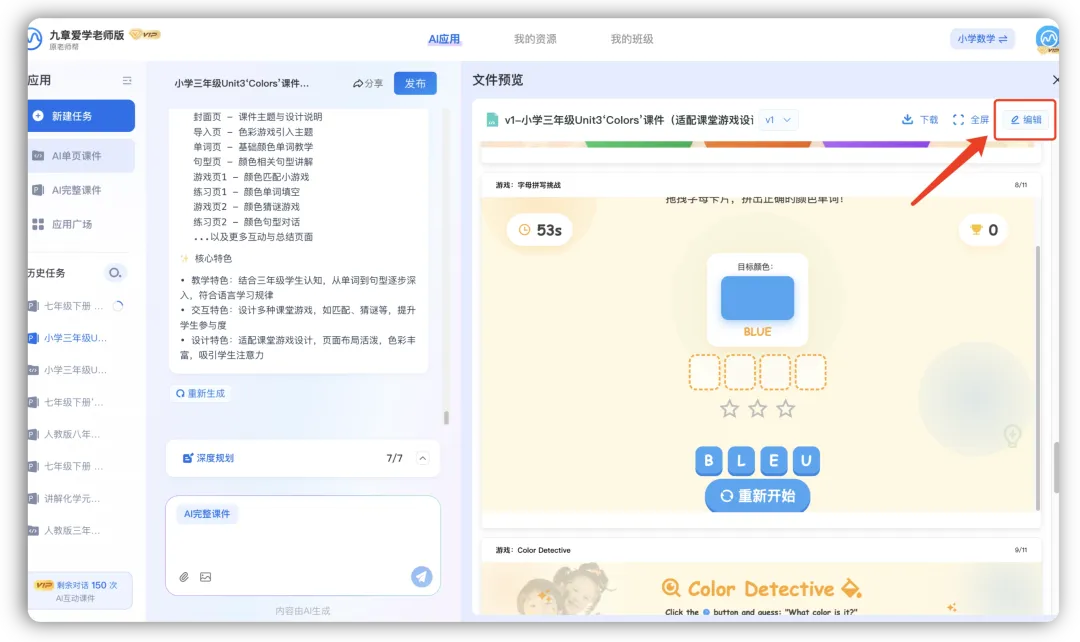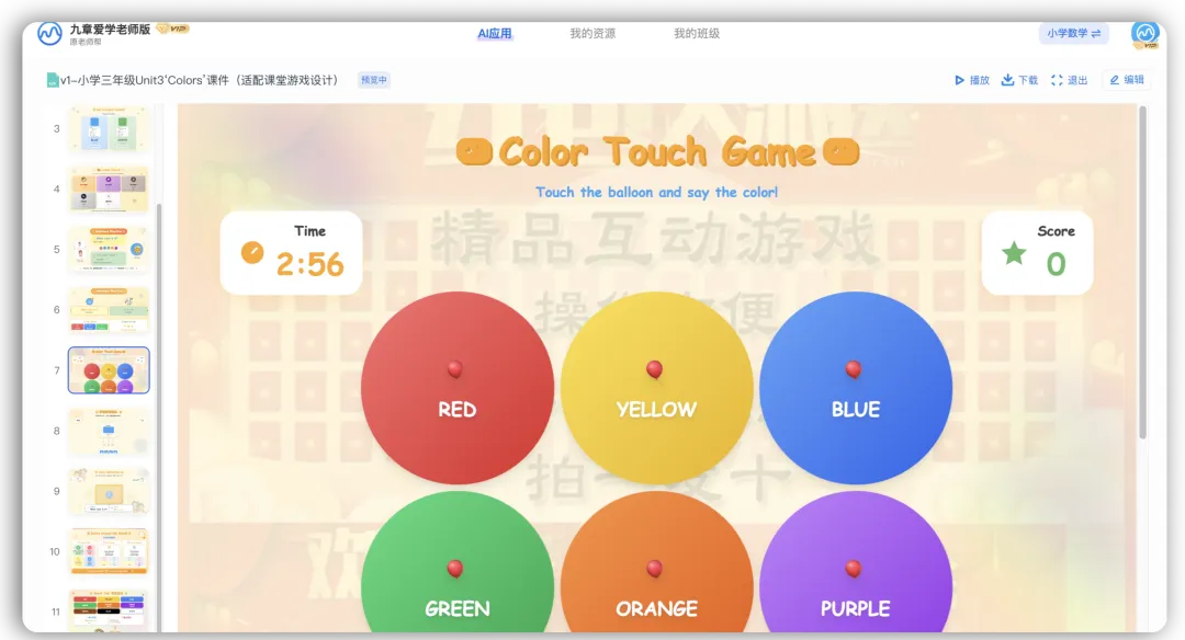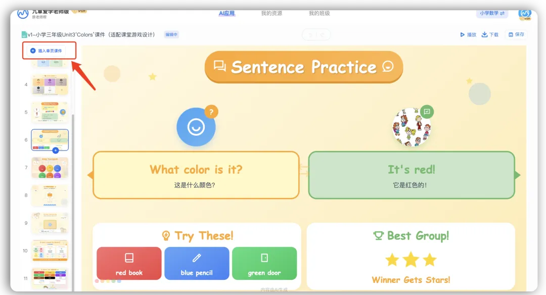 - 英语老师:“生成小学三年级Unit3‘Colors’课件,适配课堂游戏设计”——课件自带单词卡片、句型练习、互动小游戏流程,版式风格贴合低学段学生认知特点;