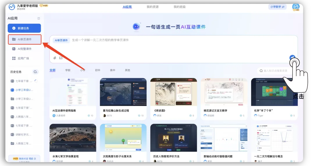 很多老师担心AI工具操作复杂,九章爱学老师版用极简流程打破顾虑,全程只需三步:1. 输入需求:打开九章爱学老师版,在课件生成入口输入一句话指令(越具体越精准,可标注教材版本、学段、所需环节);2. 智能生成:系统3-30秒快速解析需求,生成完整课件初稿,包含封面、知识点页、例题/互动页、总结页,自动搭配适配版式和素材;3. 微调优化:根据教学需求修改细节,比如替换专属例题、调整动画顺序,一键导出HTML格式的互动课件,直接用于课堂演示。从前两小时的备课工作量,现在5分钟就能搞定,剩下的时间的可以用来打磨教学话术、设计课堂互动,真正实现“减负增效”。我们始终相信,AI工具不是替代老师,而是成为老师的得力伙伴——把繁琐的排版、素材搜集工作交给AI,让老师能将更多精力投入到学情分析、个性化教学设计中,用专业与热爱陪伴学生成长。九章爱学老师版将持续深耕教育场景,带来更多实用功能。现在就打开工具,用一句话生成你的第一份AI课件,解锁高效备课新方式吧!