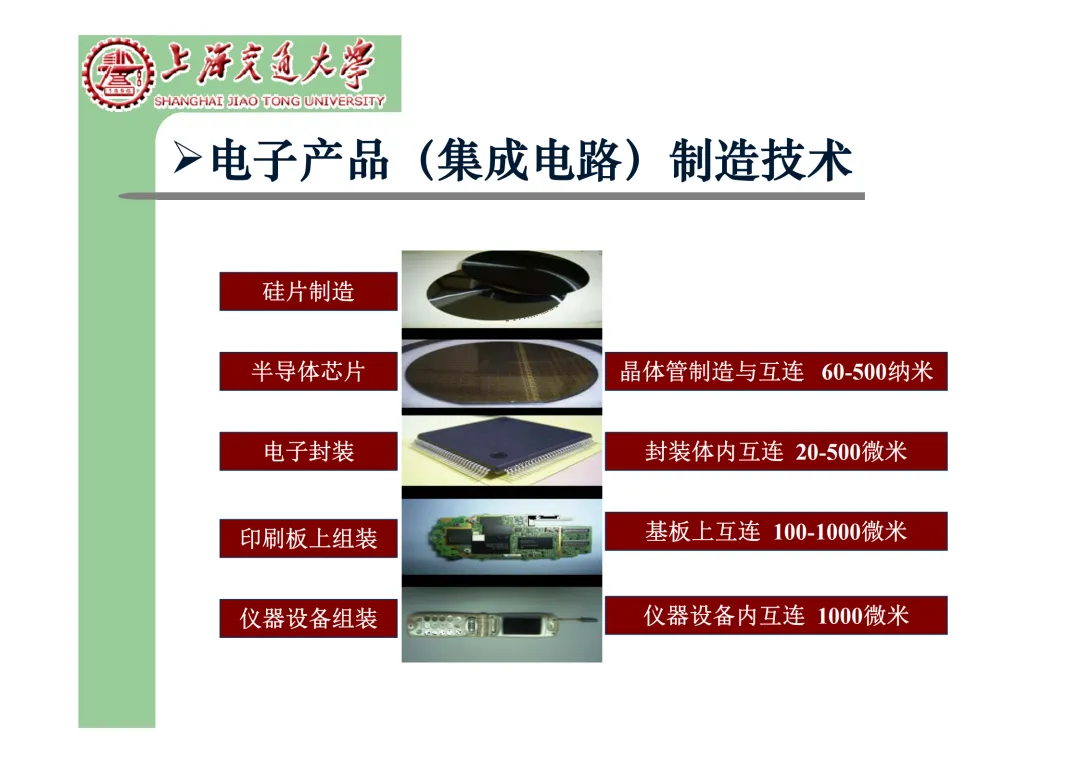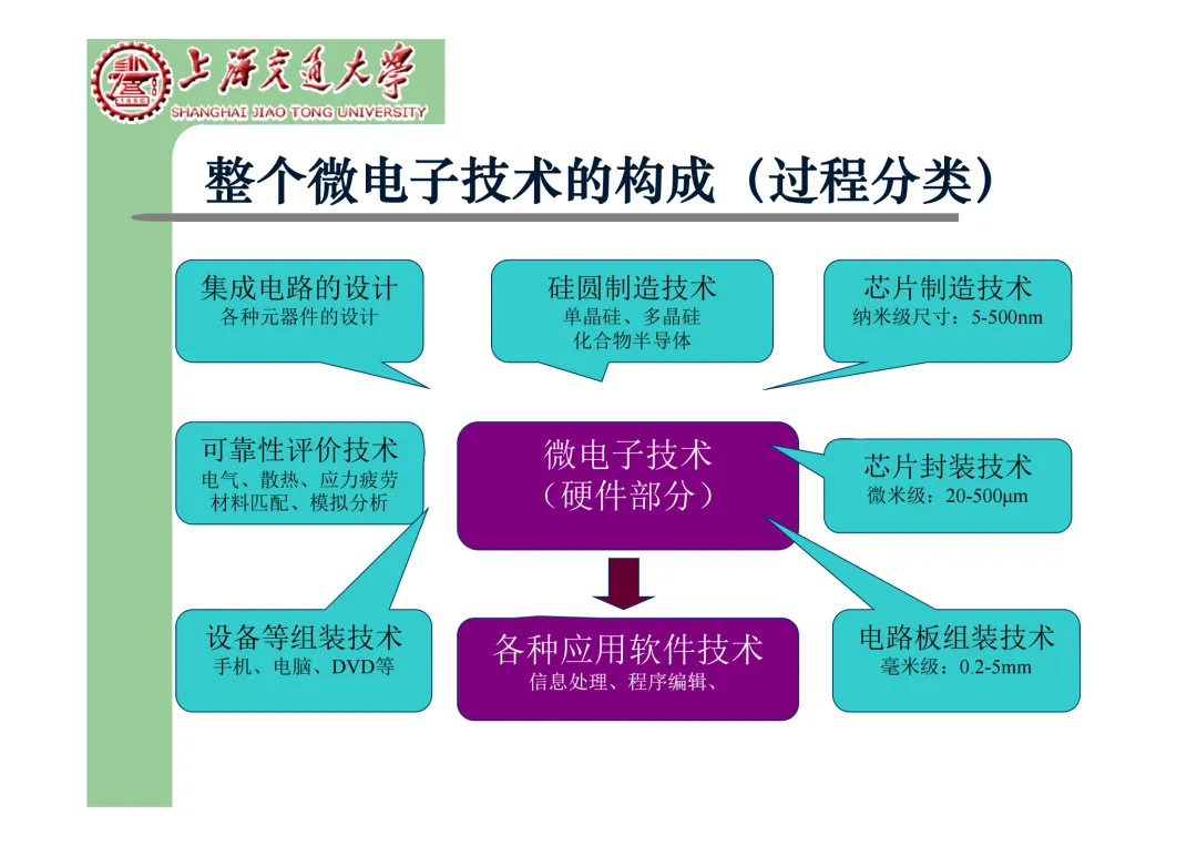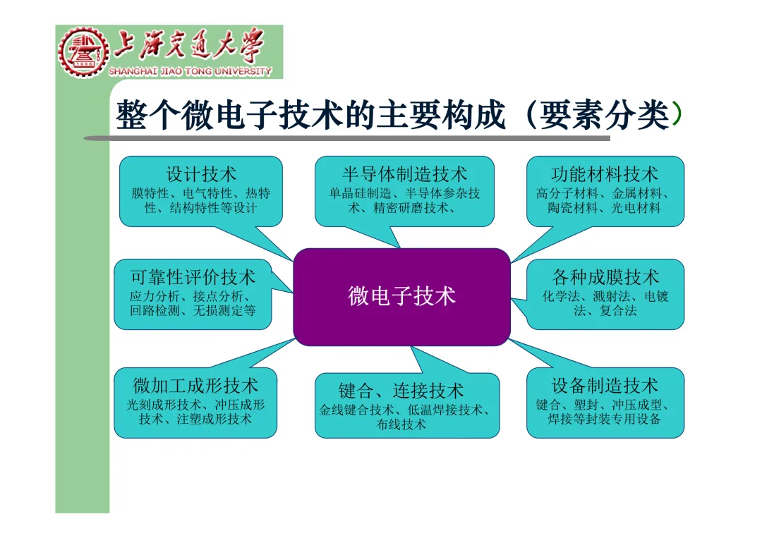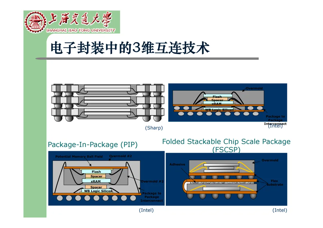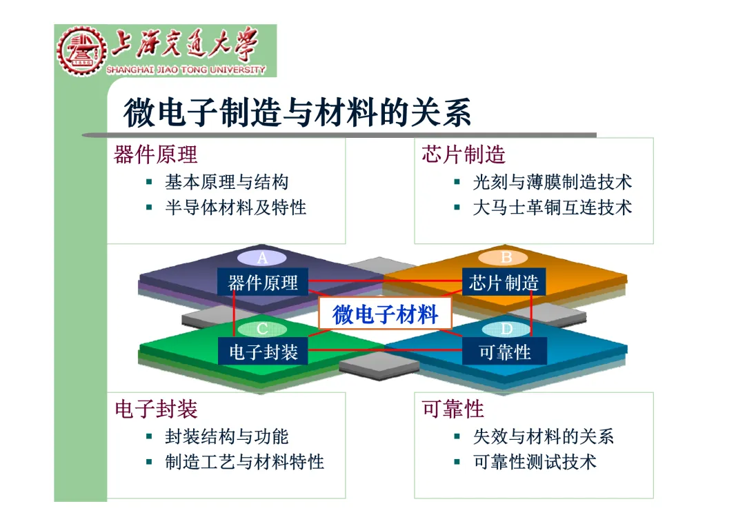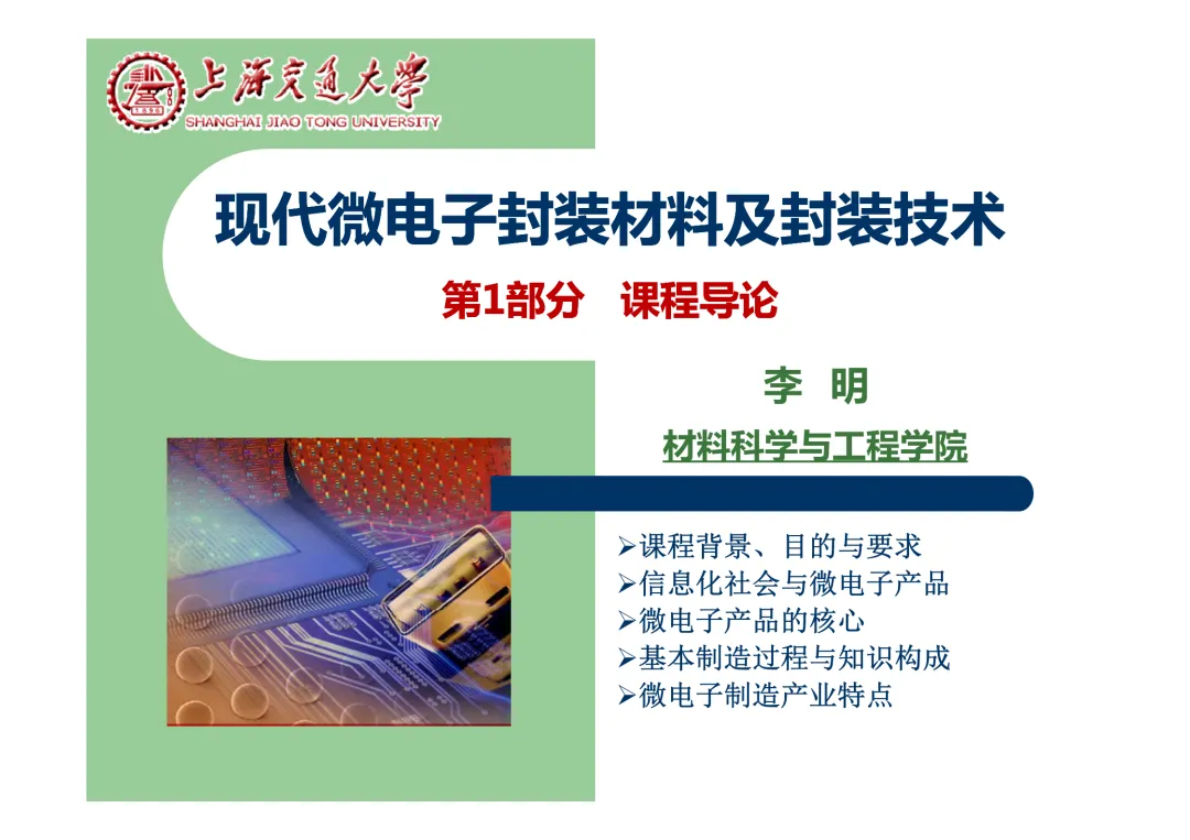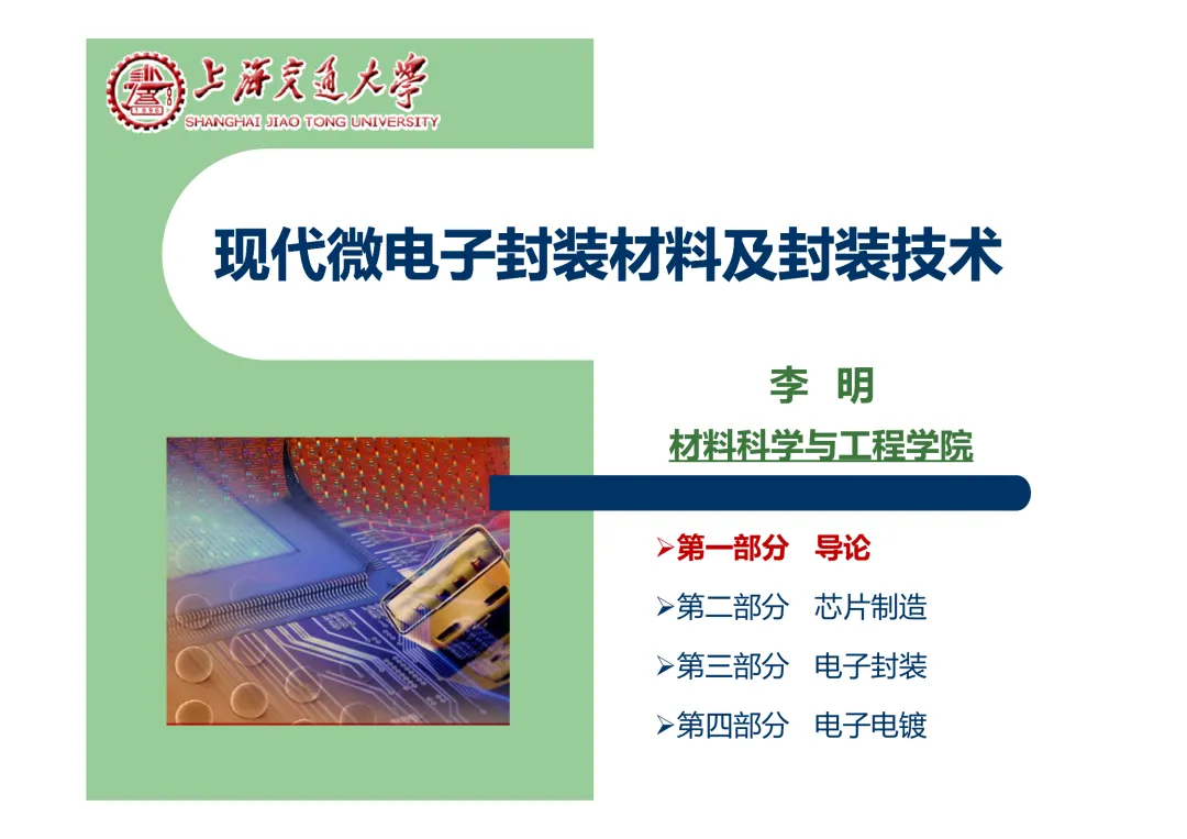 我们要学习《现代微电子封装材料及封装技术》,是为集成电路提供物理保护、电气连接、散热管理与机械支撑。随着摩尔定律逼近极限,先进封装技术已成为提升芯片性能、实现“超越摩尔”发展的关键路径。在封装材料方面,主要分为金属、陶瓷和高分子(塑料)三大体系。①金属材料(如铜、铝及其合金)导热性好但热膨胀系数高;②陶瓷材料(如Al₂O₃、AlN)耐湿性好、热导率高,适用于高性能领域;③高分子材料,成本低廉的环氧模塑料等高分子材料占据了塑封市场的90%以上。材料的发展趋势是高性能化与绿色化,例如开发高导热复合材料(如Al/SiC)以及无卤、无铅的环保材料。在封装技术上,经历了从通孔插装(DIP)、表面贴装(QFP)到阵列封装(BGA、PGA)的演进。当前主流已进入先进封装时代,其核心是通过异构集成来提升系统性能与集成度。关键技术包括:用于高密度互连的倒装芯片(FC);实现芯片横向集成的2.5D封装(使用硅中介层或EMIB桥接);以及通过硅通孔(TSV) 进行垂直堆叠的3D封装(如HBM内存);还有集成多种功能芯片的系统级封装(SiP) 和基于小芯片(Chiplet)的设计理念。此外,晶圆级封装(WLP) 直接在晶圆上完成封装,能实现最小的封装尺寸。文末提供完整文档下载,文档版权©上海交通大学-材料科学与工程学院-李明教授
