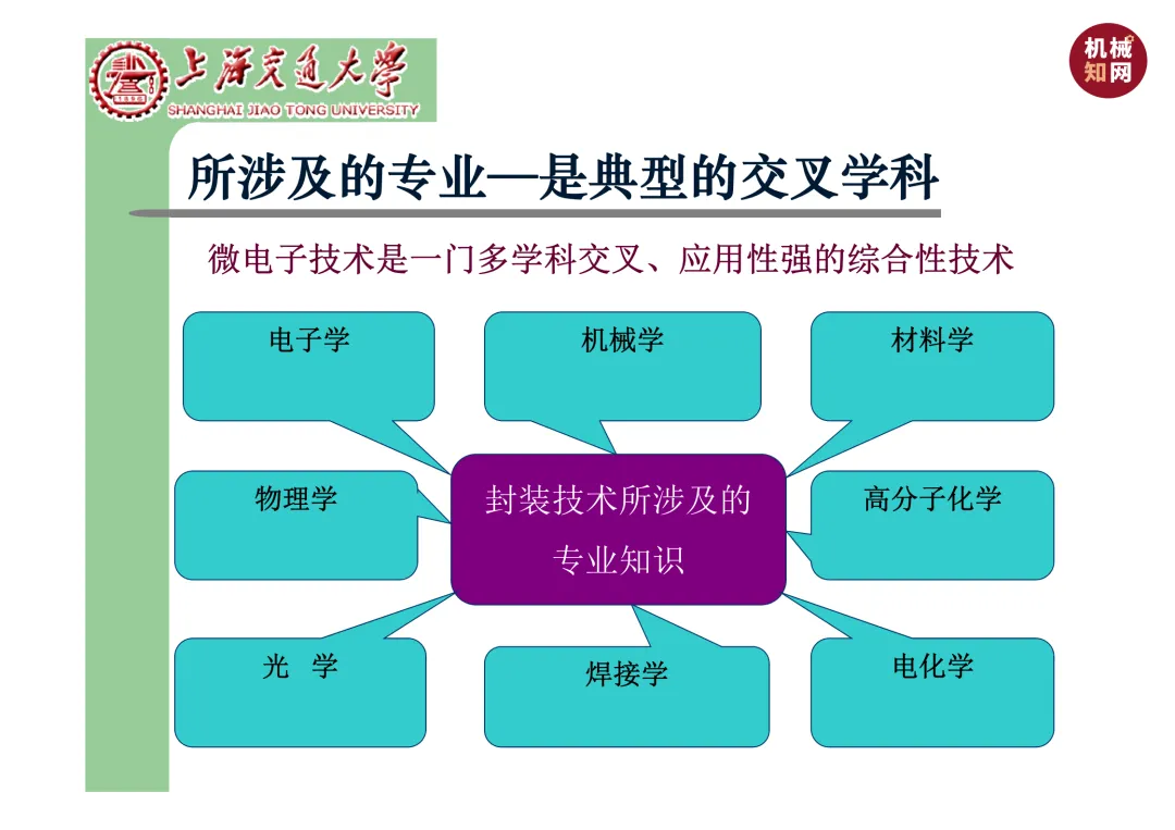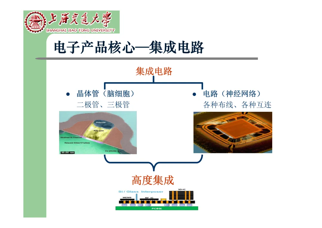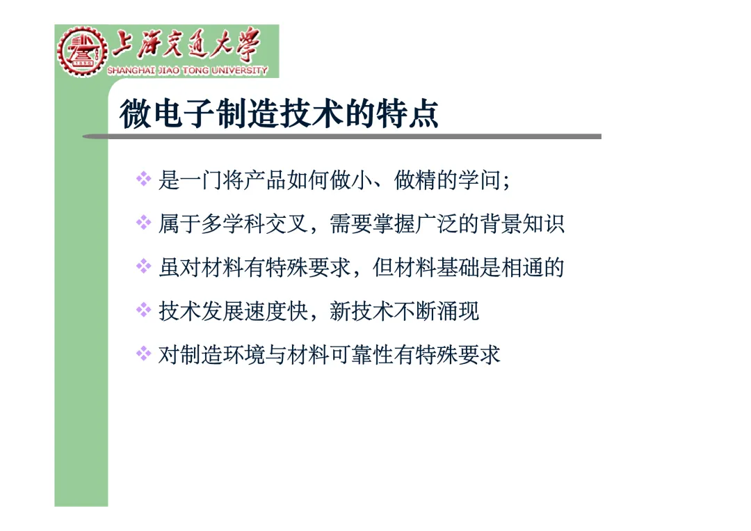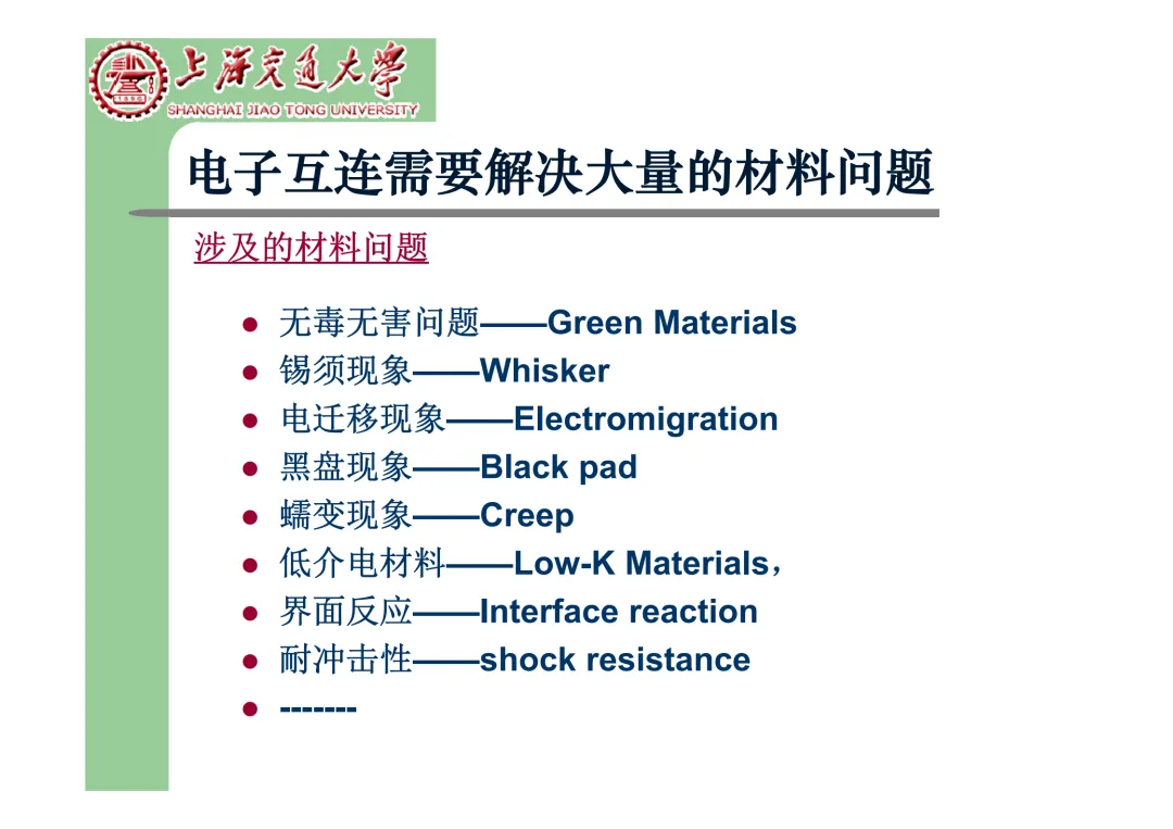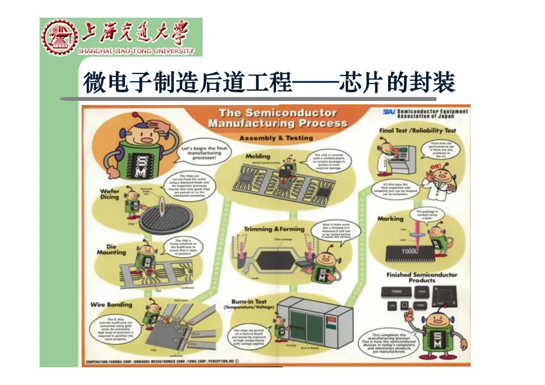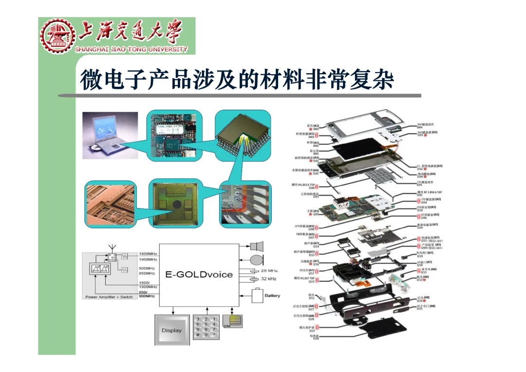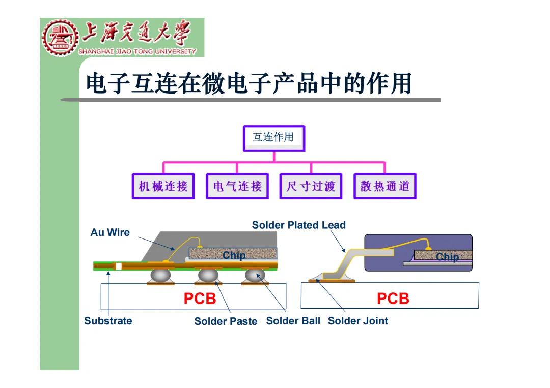 我们要学习《现代微电子封装材料及封装技术》,是为集成电路提供物理保护、电气连接、散热管理与机械支撑。随着摩尔定律逼近极限,先进封装技术已成为提升芯片性能、实现“超越摩尔”发展的关键路径。在封装材料方面,主要分为金属、陶瓷和高分子(塑料)三大体系。①金属材料(如铜、铝及其合金)导热性好但热膨胀系数高;②陶瓷材料(如Al₂O₃、AlN)耐湿性好、热导率高,适用于高性能领域;③高分子材料,成本低廉的环氧模塑料等高分子材料占据了塑封市场的90%以上。材料的发展趋势是高性能化与绿色化,例如开发高导热复合材料(如Al/SiC)以及无卤、无铅的环保材料。在封装技术上,经历了从通孔插装(DIP)、表面贴装(QFP)到阵列封装(BGA、PGA)的演进。当前主流已进入先进封装时代,其核心是通过异构集成来提升系统性能与集成度。关键技术包括:用于高密度互连的倒装芯片(FC);实现芯片横向集成的2.5D封装(使用硅中介层或EMIB桥接);以及通过硅通孔(TSV) 进行垂直堆叠的3D封装(如HBM内存);还有集成多种功能芯片的系统级封装(SiP) 和基于小芯片(Chiplet)的设计理念。此外,晶圆级封装(WLP) 直接在晶圆上完成封装,能实现最小的封装尺寸。文末提供完整文档下载,文档版权©上海交通大学-材料科学与工程学院-李明教授