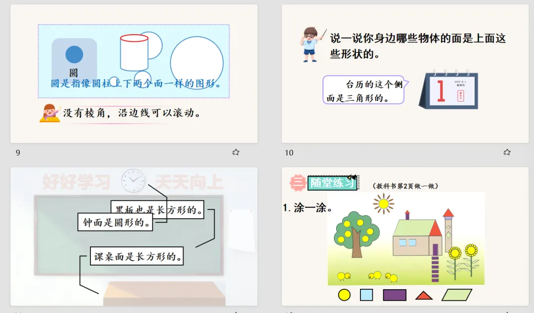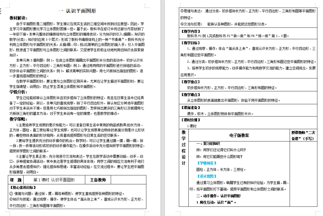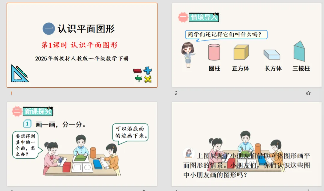 >【数学教案课件】新教材人教版小学数学一年级下册全册核心素养表格配套课件(含反思)《第1课时 认识平面图形》