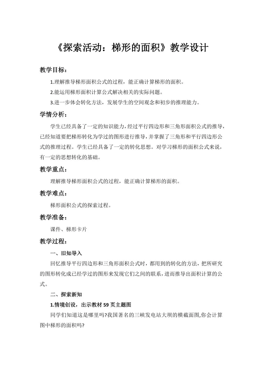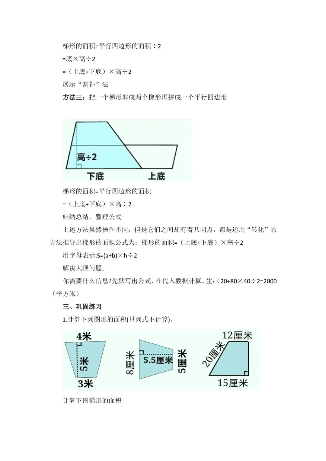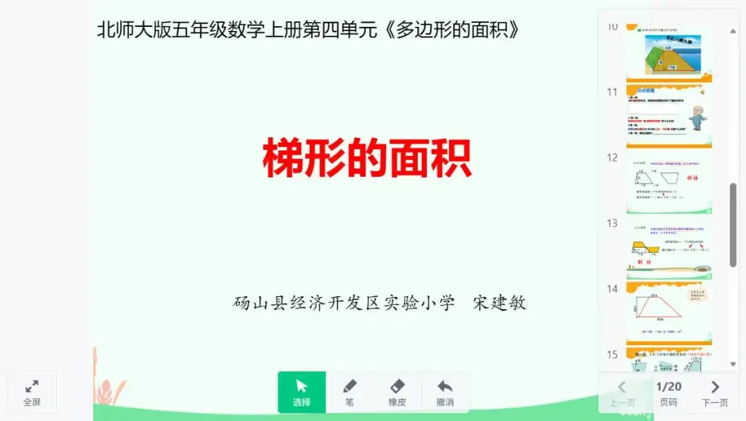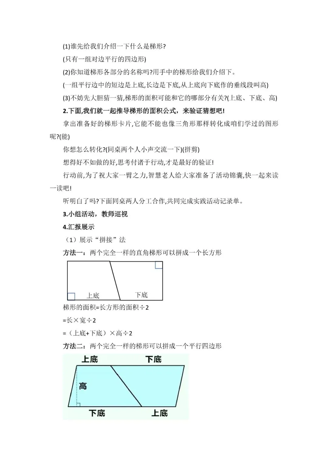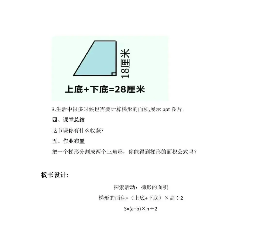 本节课引导学生经历“猜想—操作—验证—推导”的完整探究过程,巧妙利用数字化工具,将梯形面积的转化与公式推导变得直观生动,有效突破了教学难点。