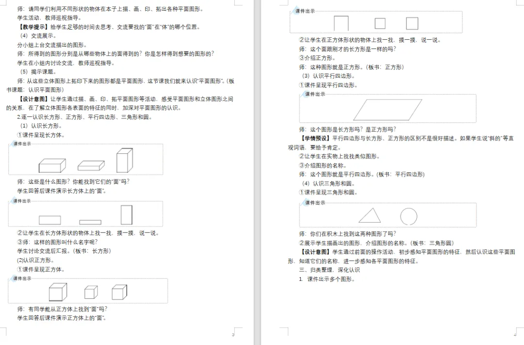 >【数学教案课件】新教材教科版版小学数学一年级下册全册文本配套教案(含反思)《第1课时 认识平面图形》