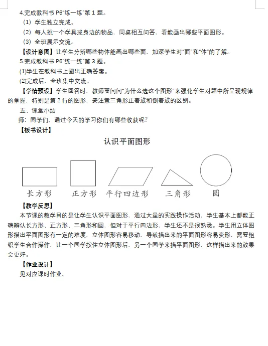 【数学教案课件】新教材教科版版小学数学一年级下册全册文本配套教案(含反思)《第1课时 认识平面图形》