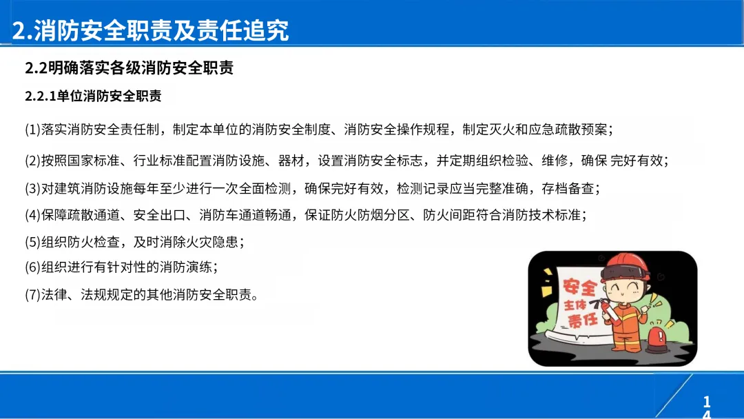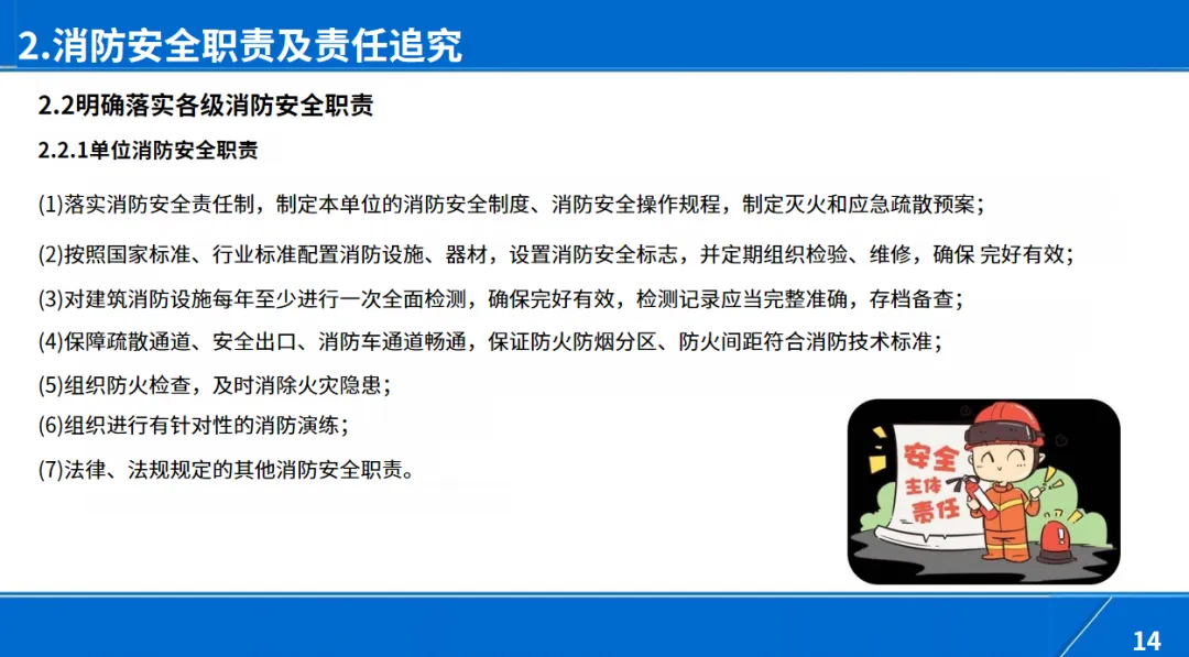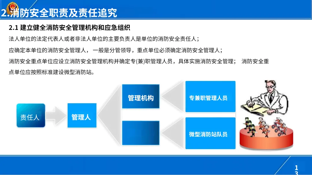 明确消防安全责任人(单位主要负责人)与管理人,重点单位设立专门管理机构,建设微型消防站。