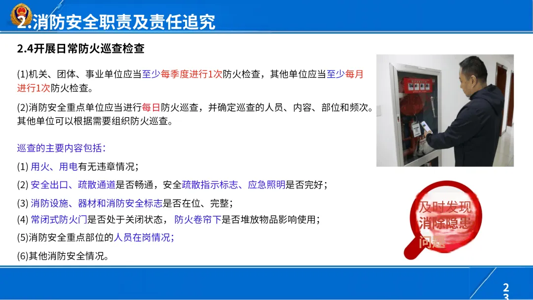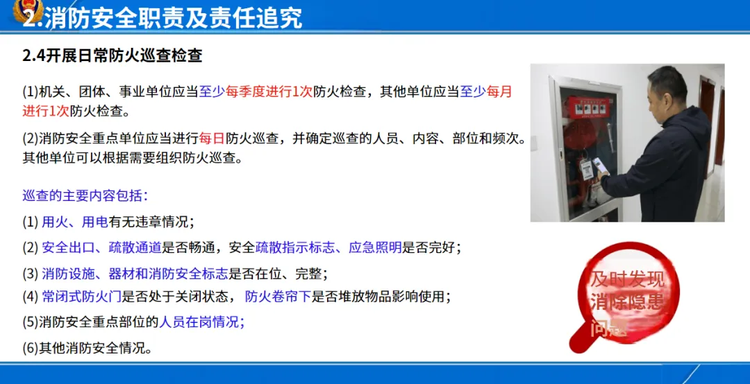 定期开展防火检查:一般单位每月至少1次,重点单位每日巡查,做好记录存档。