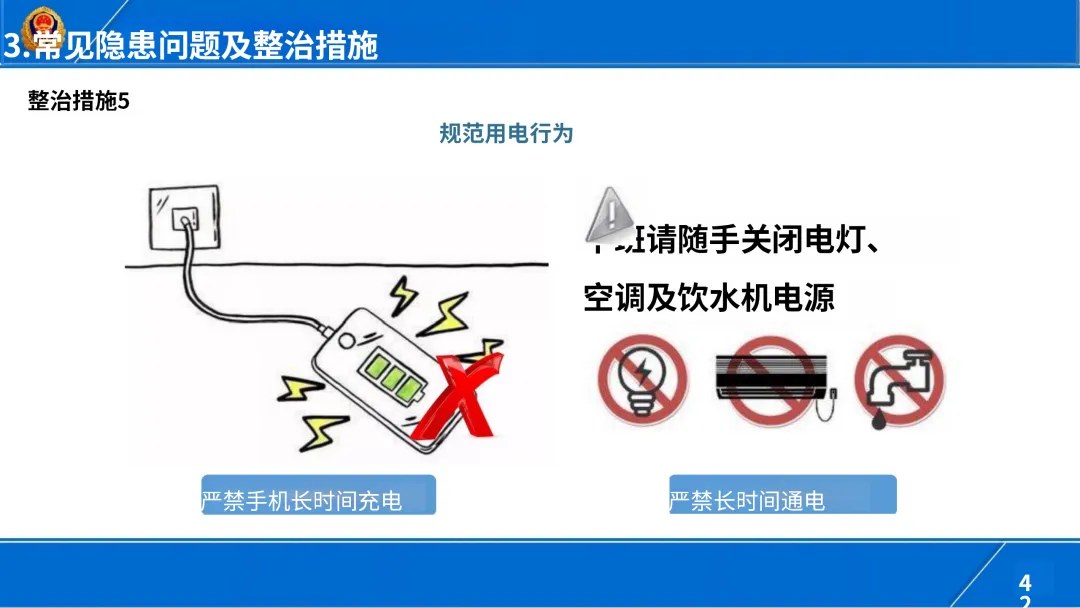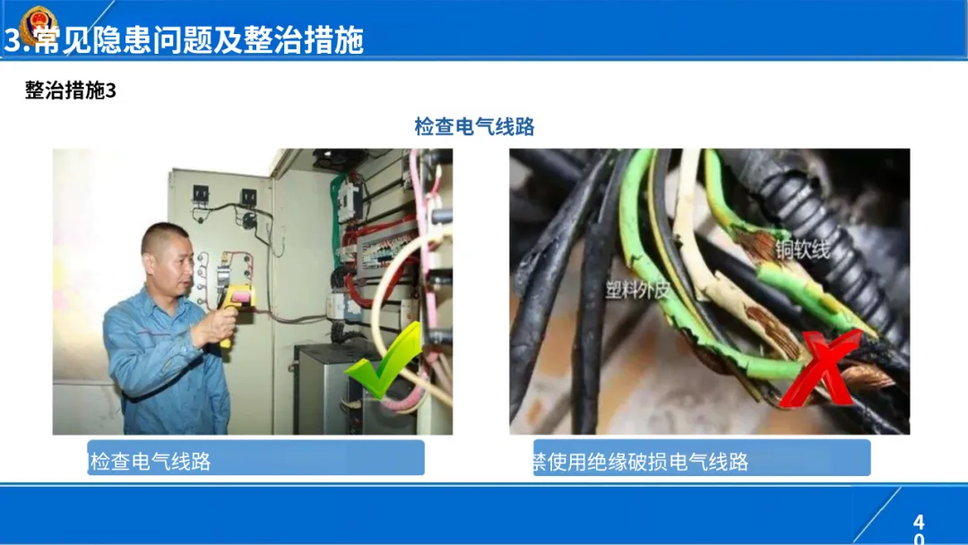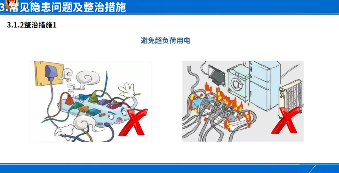 整治措施:避免大功率电器共用插座,使用合格电气产品,定期检查线路绝缘情况,规范布线,下班关闭非必要电源。