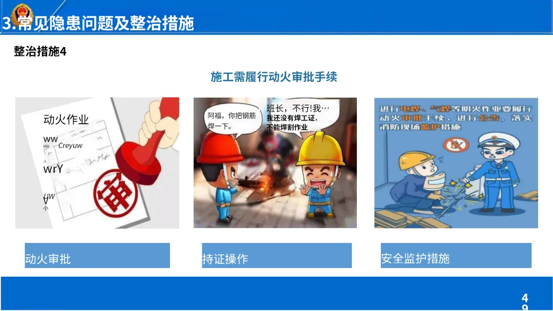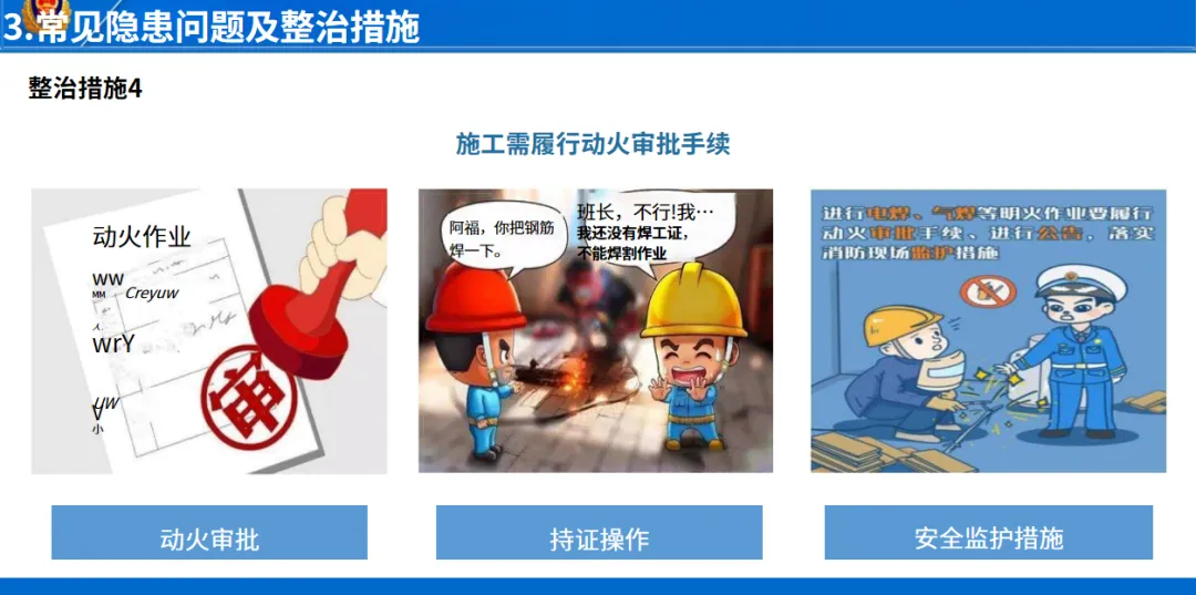 整治措施:严禁在禁烟区域吸烟,动火作业需履行审批手续、持证操作并设现场监护,明火与可燃物保持安全距离。