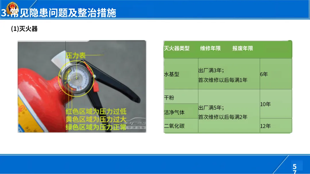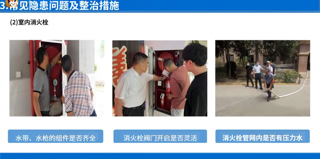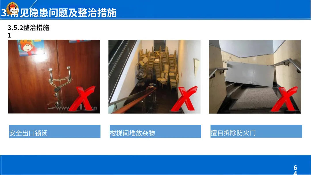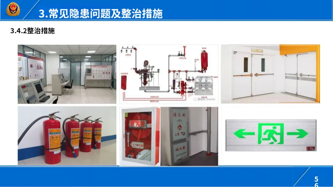整治措施:定期检查灭火器(压力正常、在有效期内)、消火栓(组件齐全、管网有水),确保火灾报警、自动灭火系统完好,常闭式防火门保持关闭。