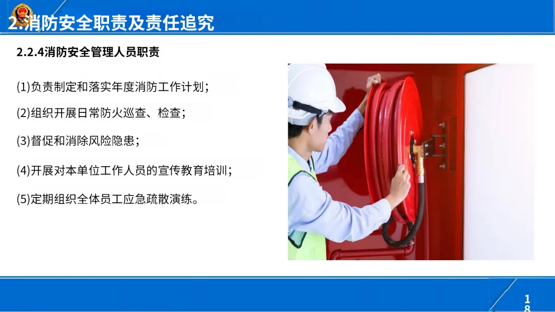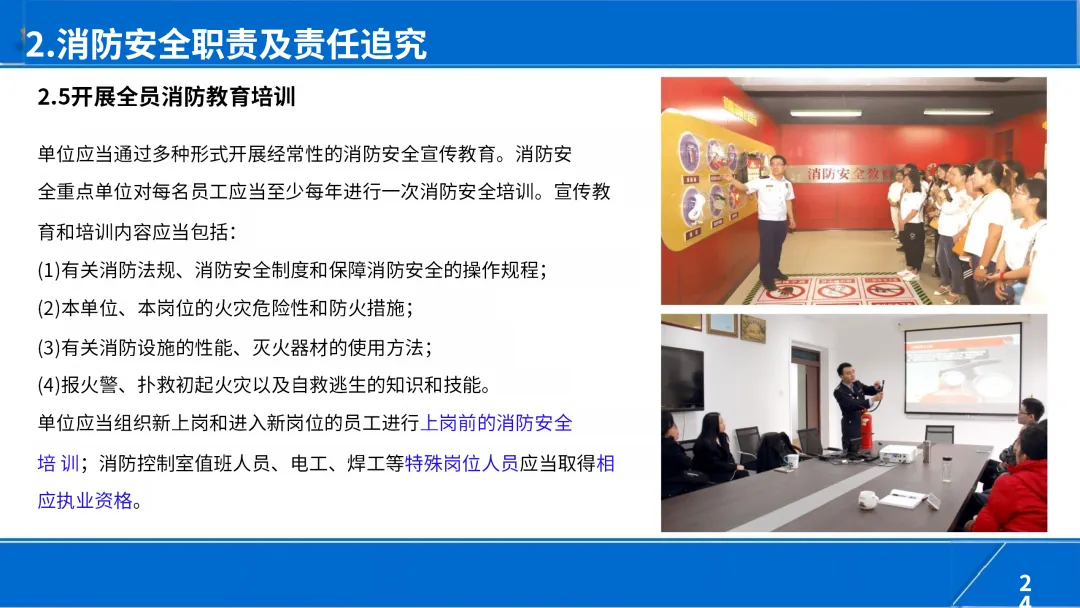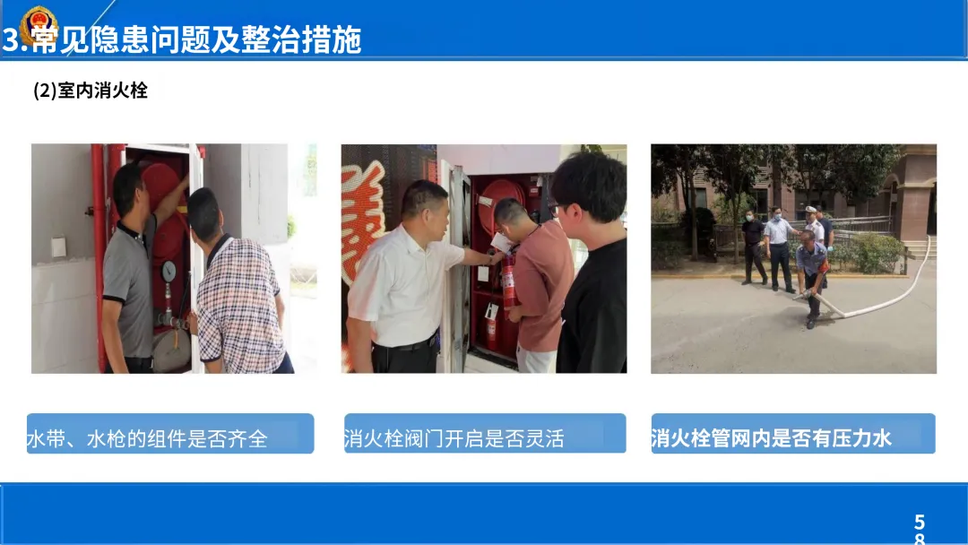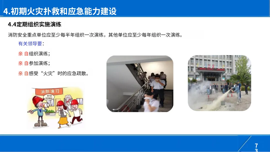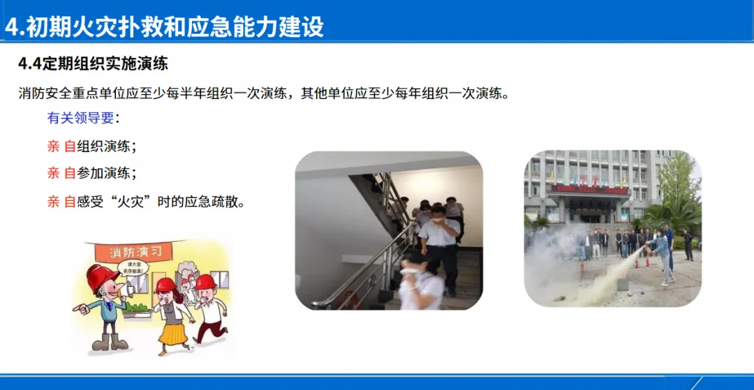 全员消防培训:重点单位每年至少1次全员培训,新员工上岗前必须培训,覆盖法规、风险、设施使用、自救技能。