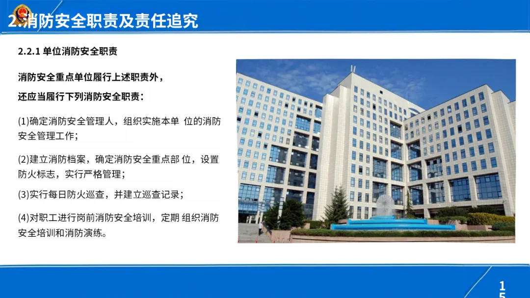 单位层面:配置消防设施器材并定期检测,保障疏散通道与消防车通道畅通,组织防火检查与演练。