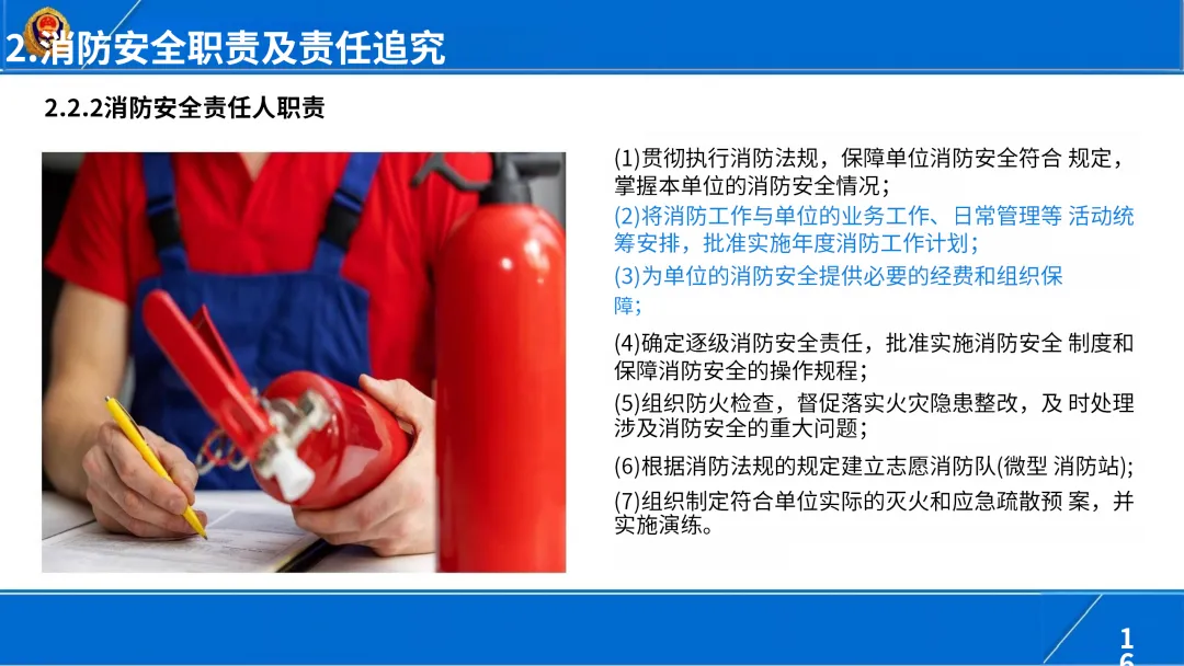 责任人职责:统筹消防工作,提供经费保障,组织隐患整改,审批消防工作计划与预案。