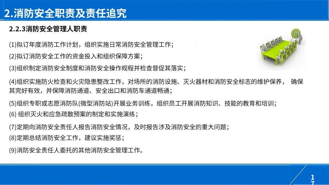 管理人职责:实施日常消防管理,组织培训与演练,维护消防设施,定期报告消防安全情况