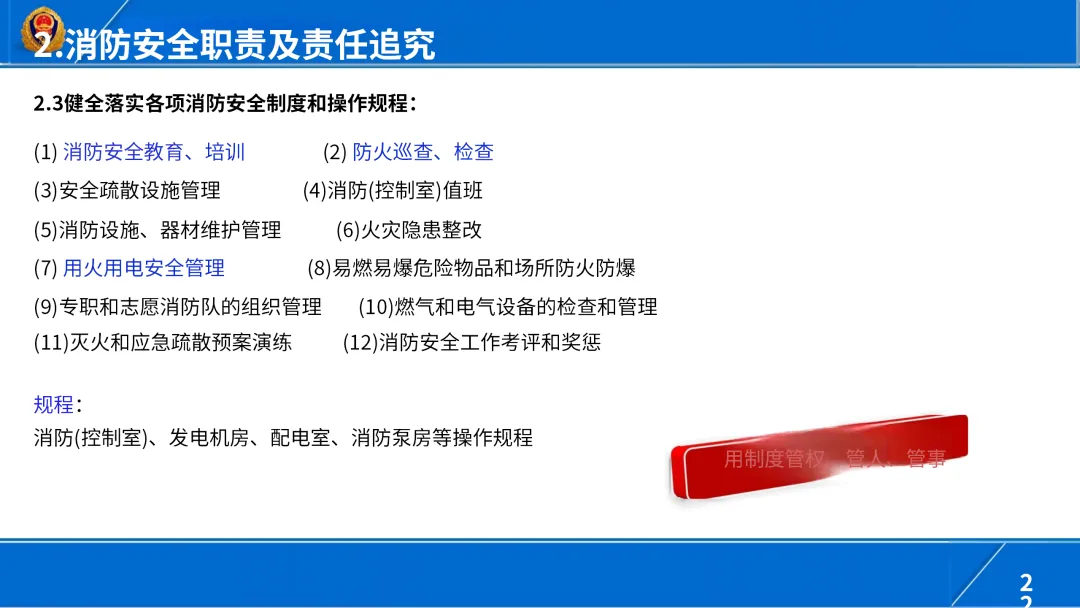 健全消防安全制度与操作规程,涵盖用火用电管理、设施维护、隐患整改、应急演练等核心内容。