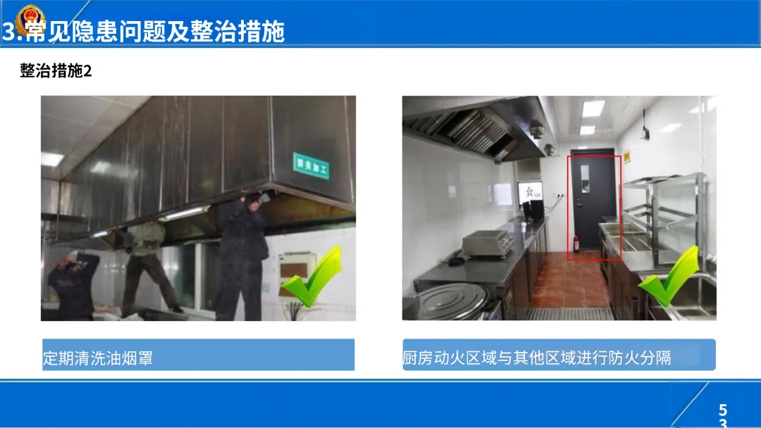 整治措施:使用合格燃气灶具,每日检查管道与胶管,定期清洗油烟罩,厨房区域与其他区域防火分隔。