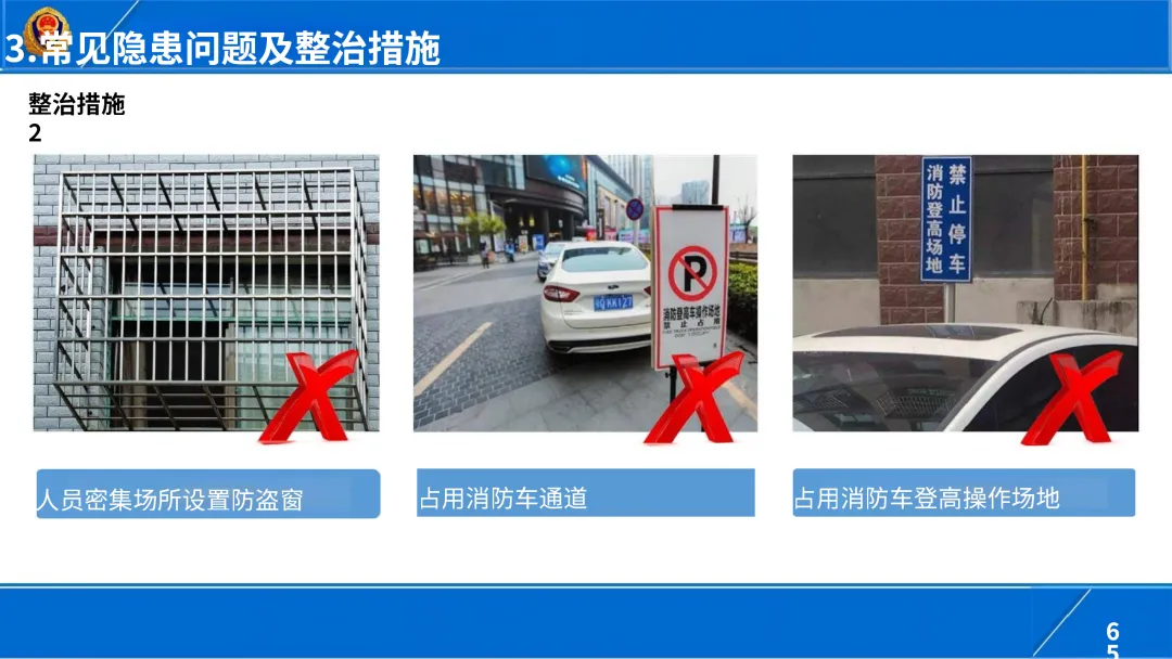 整治措施:保持安全出口与疏散通道畅通,严禁遮挡消火栓与防火间距,人员密集场所不设置影响逃生的障碍物。