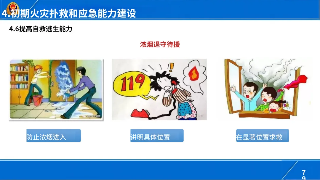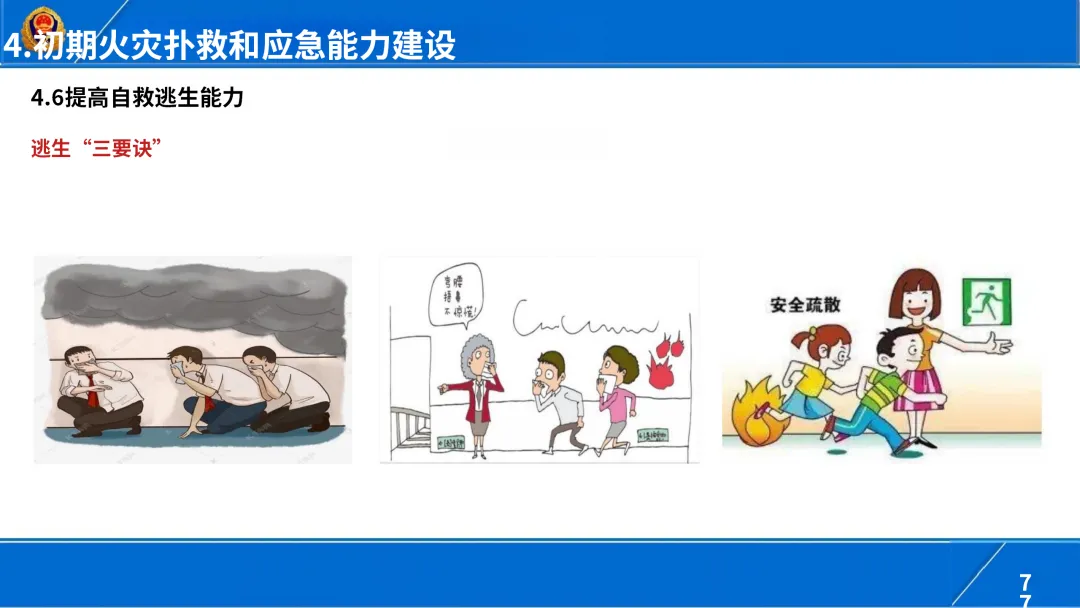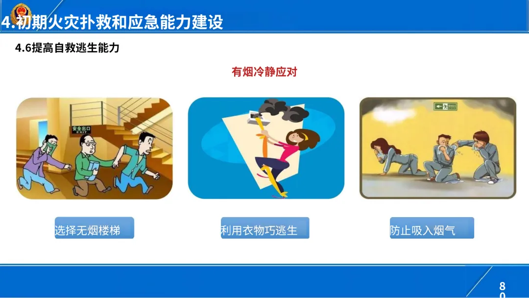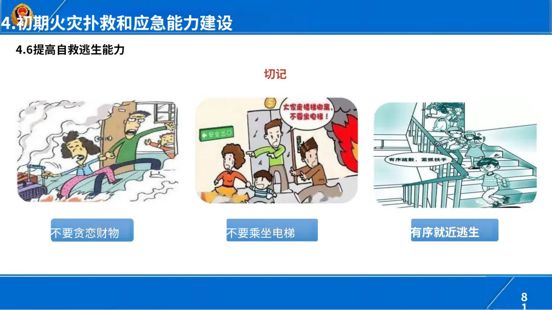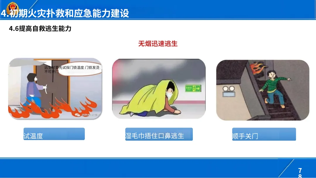 逃生技巧:无烟时迅速撤离,浓烟时用湿毛巾捂口鼻、贴近地面逃生,不乘坐电梯,顺手关门阻挡烟火,切勿贪恋财物。