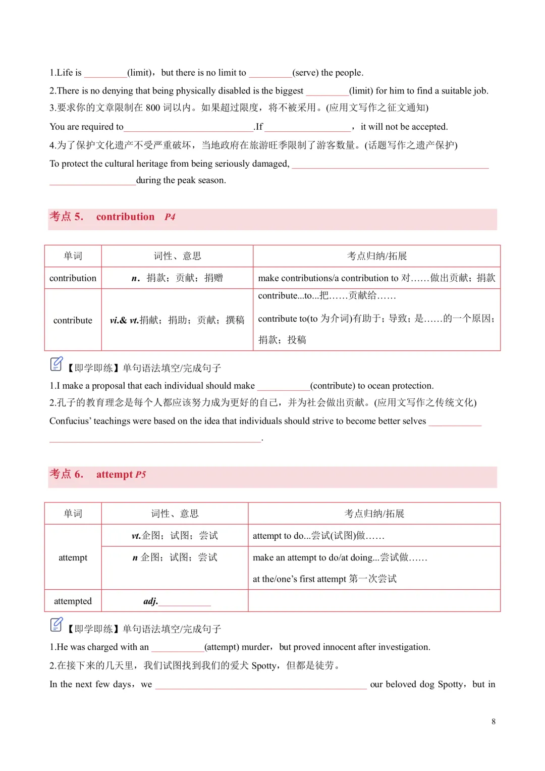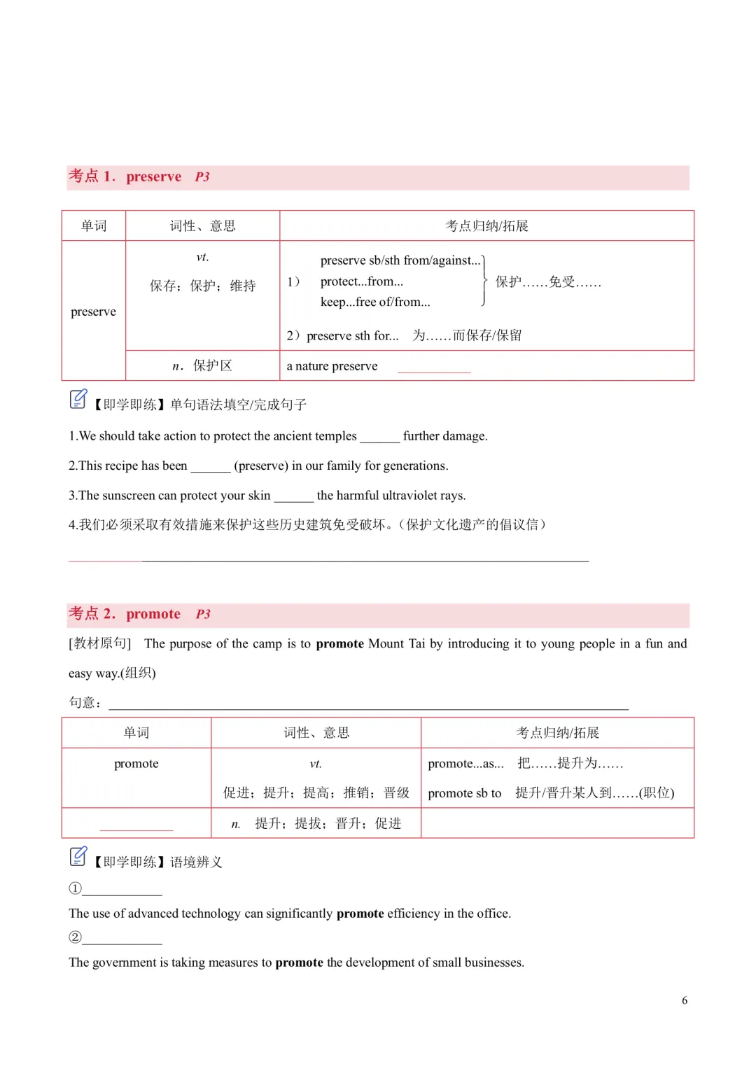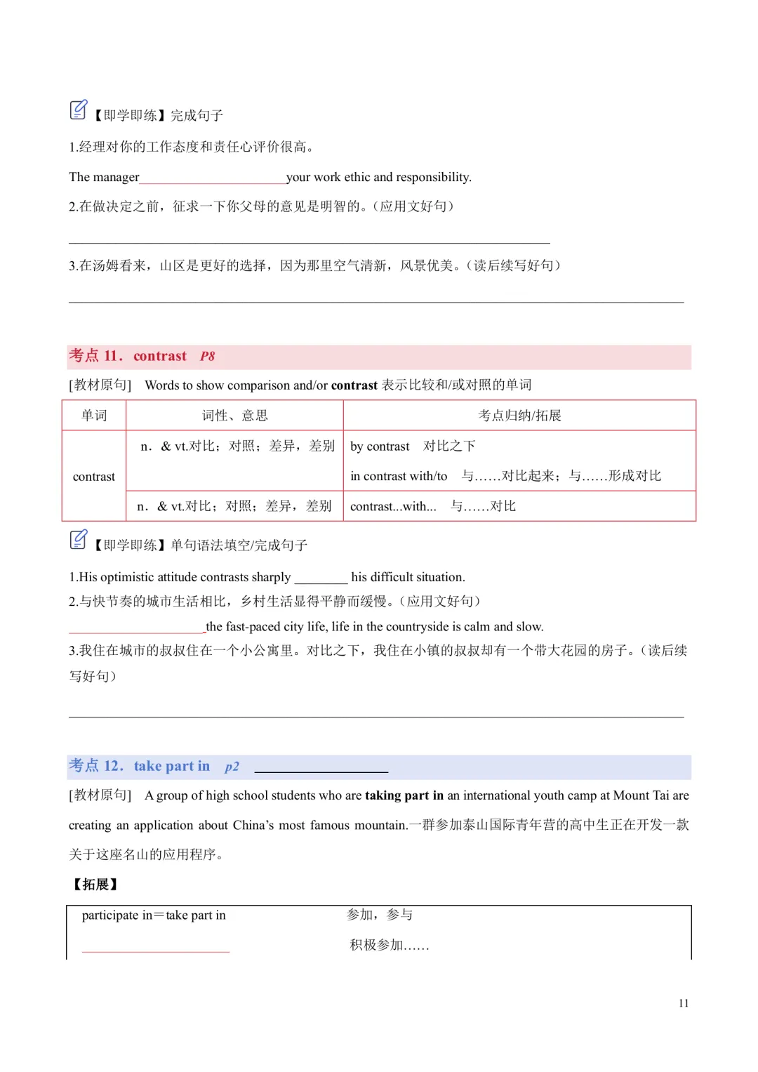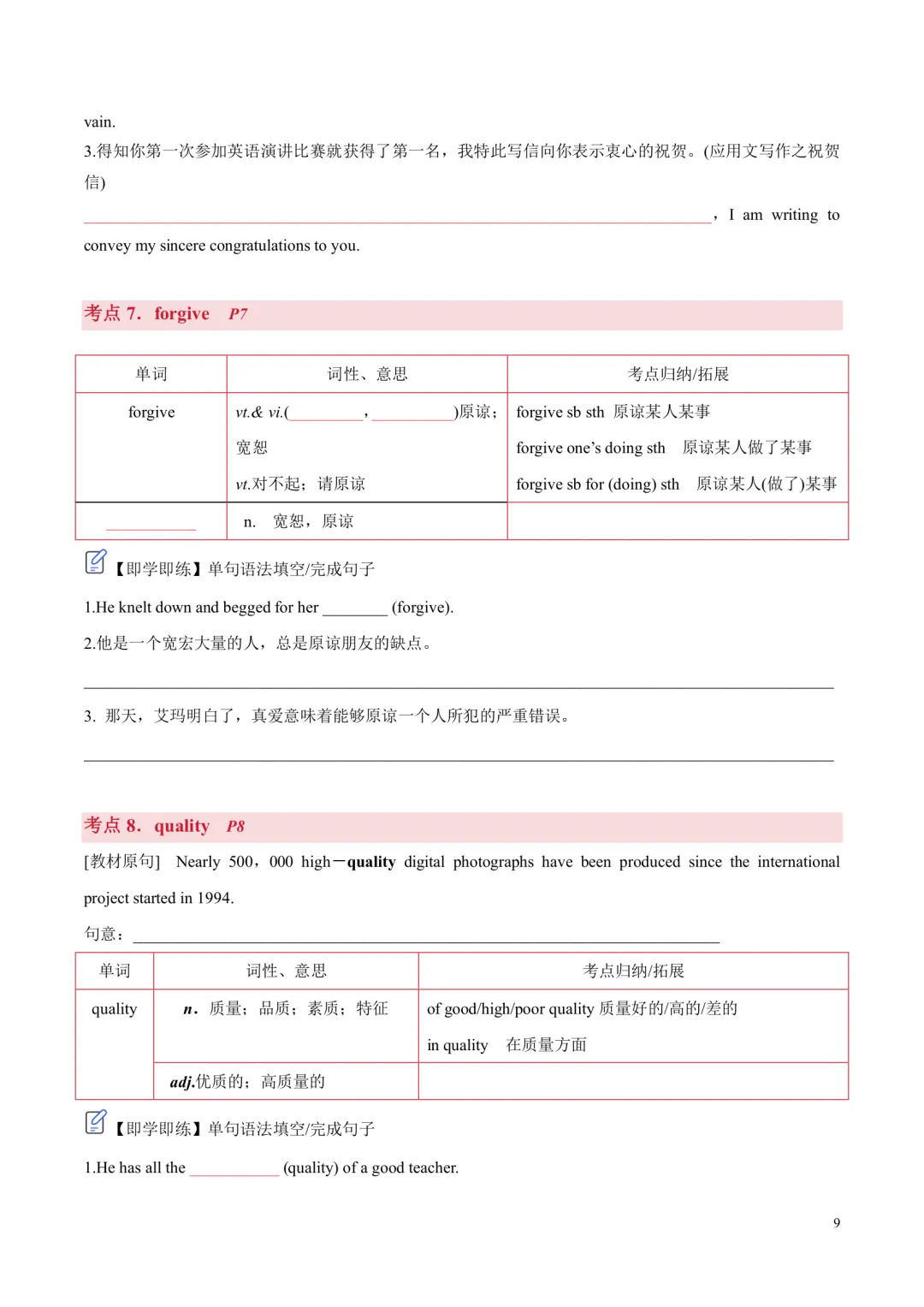 [ ]单元带音标的单词表。 [ ]单词分类记忆+重点短语+重要句型。 单词分为阅读,写作,记变形,以此方法来记忆单词,更有针对性,效率更高!句型这块是翻译句子意思,先感知如何正确使用句型,后面基础练习里面会有句式仿写来巩固。 [ ]核心单词短语句型精讲精练+构词法拓展。 每个考点都有相关考点知识归纳,有对应练习巩固。练习主要有单句语法填空,完成句子,句子翻译;含有应用文写作及读后续写好句作为练习。 [ ]基础练习 练习题量较充足,题型有:汉语提示填空,适当形式填空,短语填空,句式仿写。 [ ]提升练习 阅读理解ABC,3篇,完型1篇,七选五1篇 [ ]这部分是完全按照单元语法整理,非系统性梳理。每个考点语法有相关考点知识归纳,也有挖空性对应练习。[ ]单元语法检测练习:选择/填空/完成句子[ ]提升练习:语法填空x2[ ]单元写作写作思路。[ ]写作素材积累:常用单词/短语/句子,完成句子练习,作文练习约3篇。[ ]读后续写练习x1练习全部都有答案,在教师版里面;高考题型练习类全部有详解,其他基础性练习,有些有详解,有些只有答案 |
