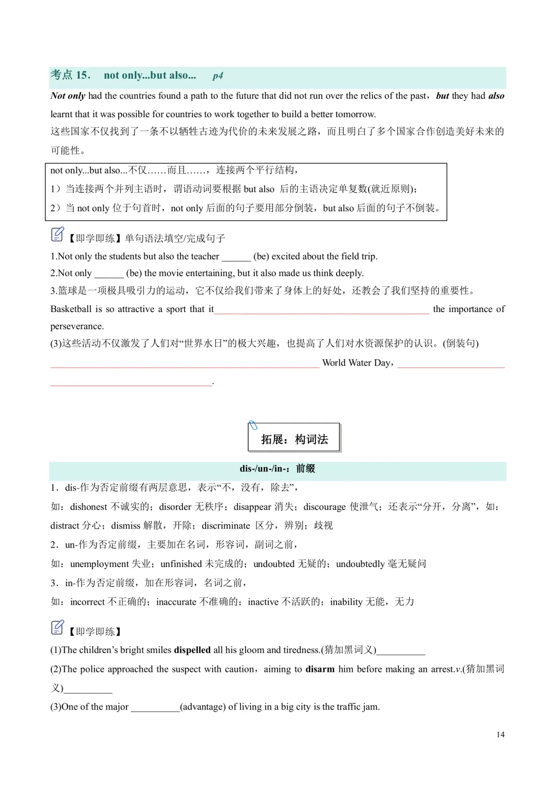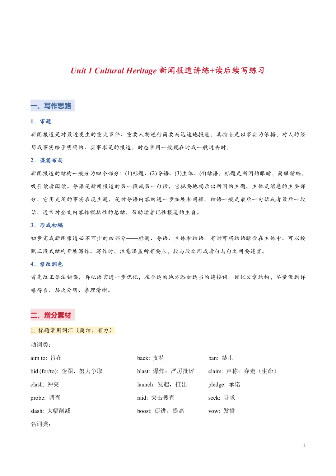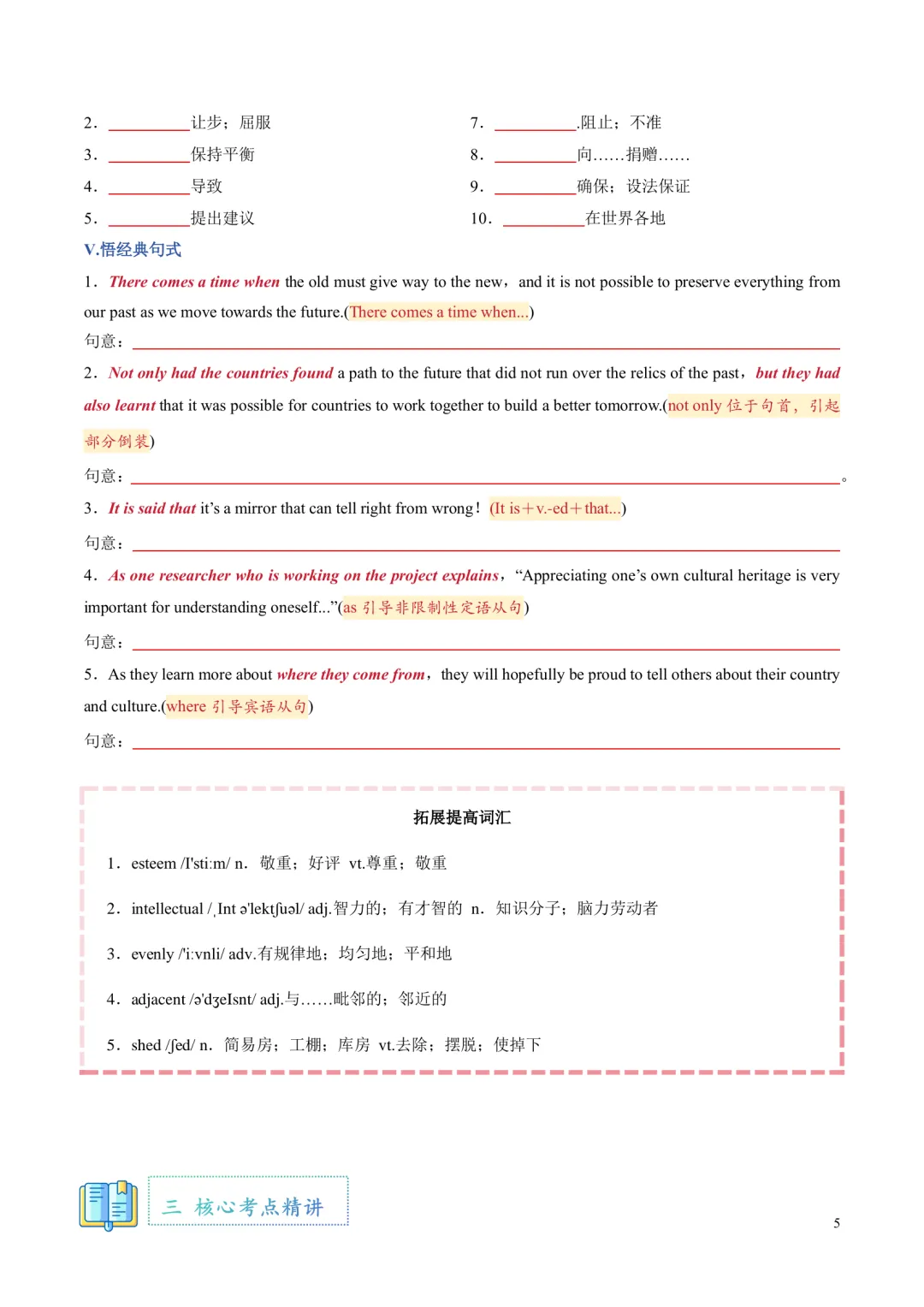 [ ]单元带音标的单词表。 [ ]单词分类记忆+重点短语+重要句型。 单词分为阅读,写作,记变形,以此方法来记忆单词,更有针对性,效率更高!句型这块是翻译句子意思,先感知如何正确使用句型,后面基础练习里面会有句式仿写来巩固。 [ ]核心单词短语句型精讲精练+构词法拓展。 每个考点都有相关考点知识归纳,有对应练习巩固。练习主要有单句语法填空,完成句子,句子翻译;含有应用文写作及读后续写好句作为练习。 [ ]基础练习 练习题量较充足,题型有:汉语提示填空,适当形式填空,短语填空,句式仿写。 [ ]提升练习 阅读理解ABC,3篇,完型1篇,七选五1篇 [ ]这部分是完全按照单元语法整理,非系统性梳理。每个考点语法有相关考点知识归纳,也有挖空性对应练习。[ ]单元语法检测练习:选择/填空/完成句子[ ]提升练习:语法填空x2[ ]单元写作写作思路。[ ]写作素材积累:常用单词/短语/句子,完成句子练习,作文练习约3篇。[ ]读后续写练习x1练习全部都有答案,在教师版里面;高考题型练习类全部有详解,其他基础性练习,有些有详解,有些只有答案 |