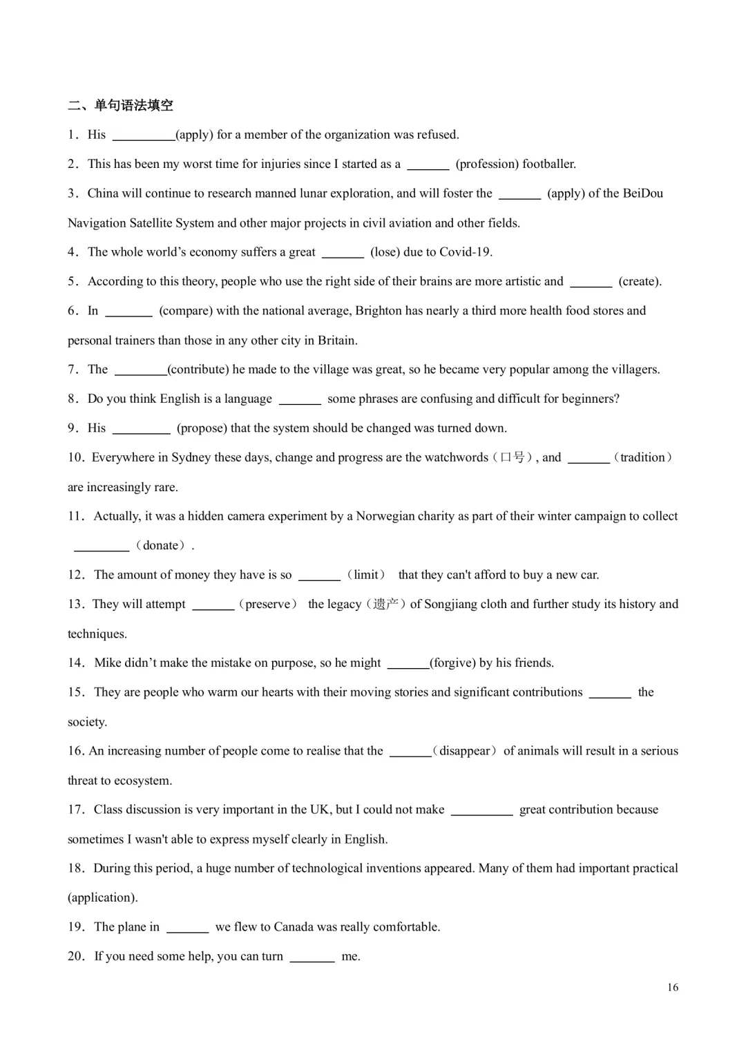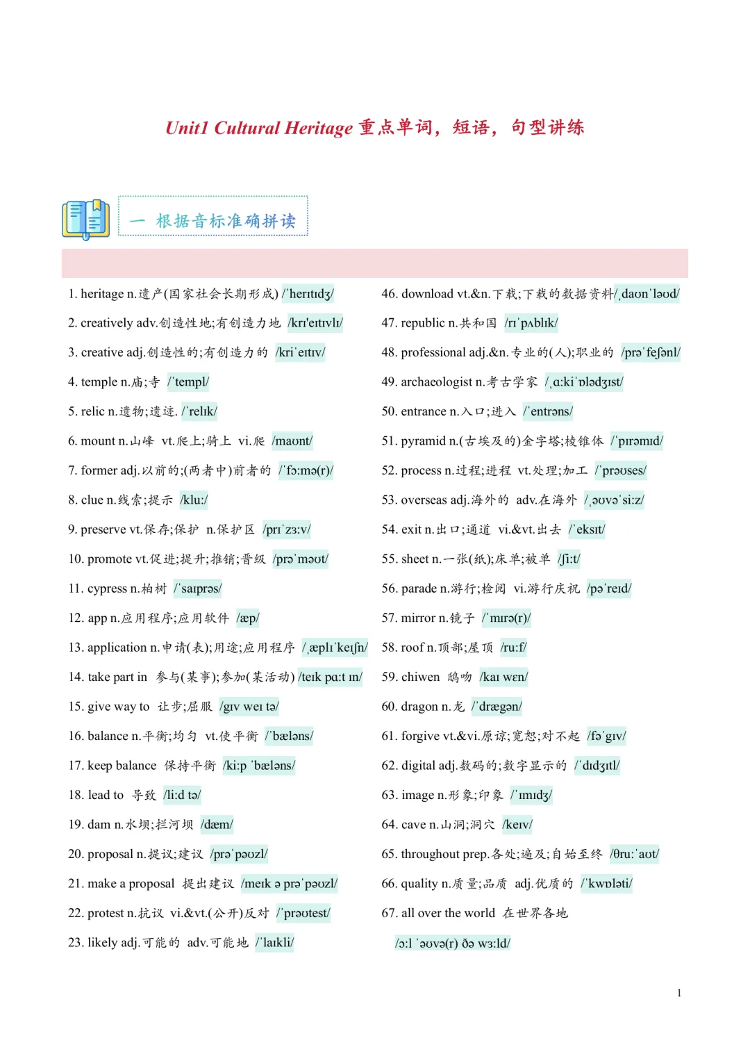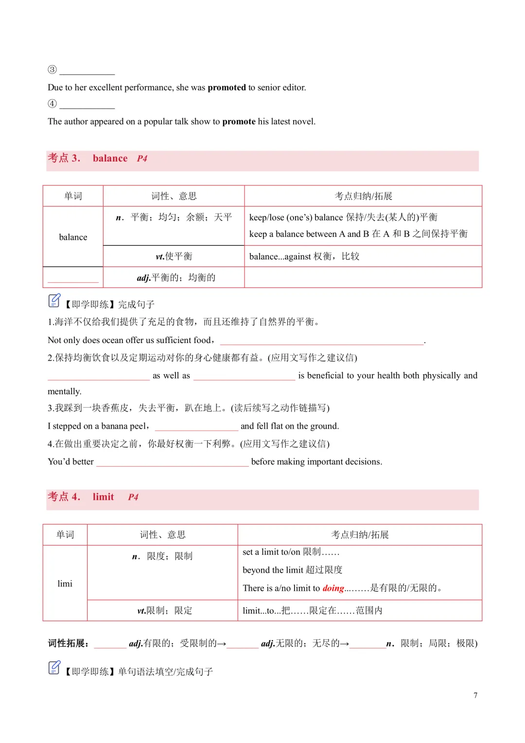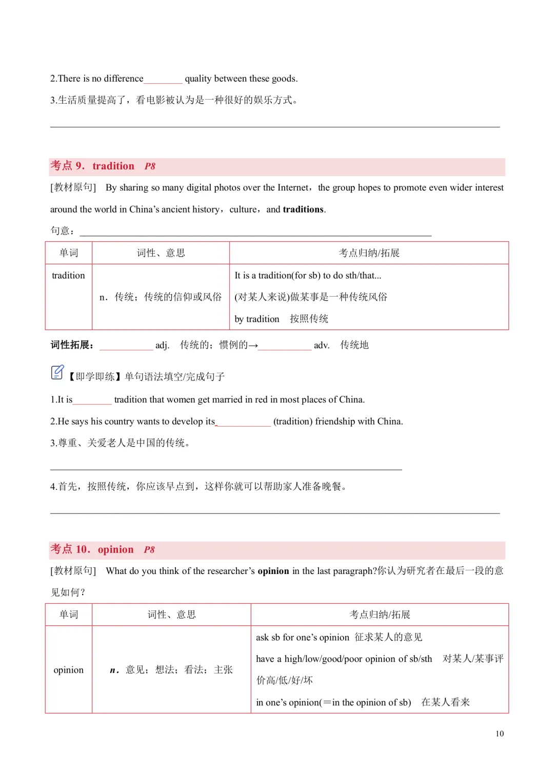 [ ]单元带音标的单词表。 [ ]单词分类记忆+重点短语+重要句型。 单词分为阅读,写作,记变形,以此方法来记忆单词,更有针对性,效率更高!句型这块是翻译句子意思,先感知如何正确使用句型,后面基础练习里面会有句式仿写来巩固。 [ ]核心单词短语句型精讲精练+构词法拓展。 每个考点都有相关考点知识归纳,有对应练习巩固。练习主要有单句语法填空,完成句子,句子翻译;含有应用文写作及读后续写好句作为练习。 [ ]基础练习 练习题量较充足,题型有:汉语提示填空,适当形式填空,短语填空,句式仿写。 [ ]提升练习 阅读理解ABC,3篇,完型1篇,七选五1篇 [ ]这部分是完全按照单元语法整理,非系统性梳理。每个考点语法有相关考点知识归纳,也有挖空性对应练习。[ ]单元语法检测练习:选择/填空/完成句子[ ]提升练习:语法填空x2[ ]单元写作写作思路。[ ]写作素材积累:常用单词/短语/句子,完成句子练习,作文练习约3篇。[ ]读后续写练习x1练习全部都有答案,在教师版里面;高考题型练习类全部有详解,其他基础性练习,有些有详解,有些只有答案 |