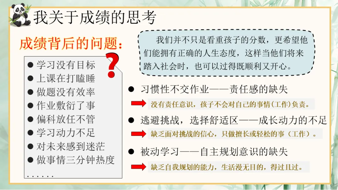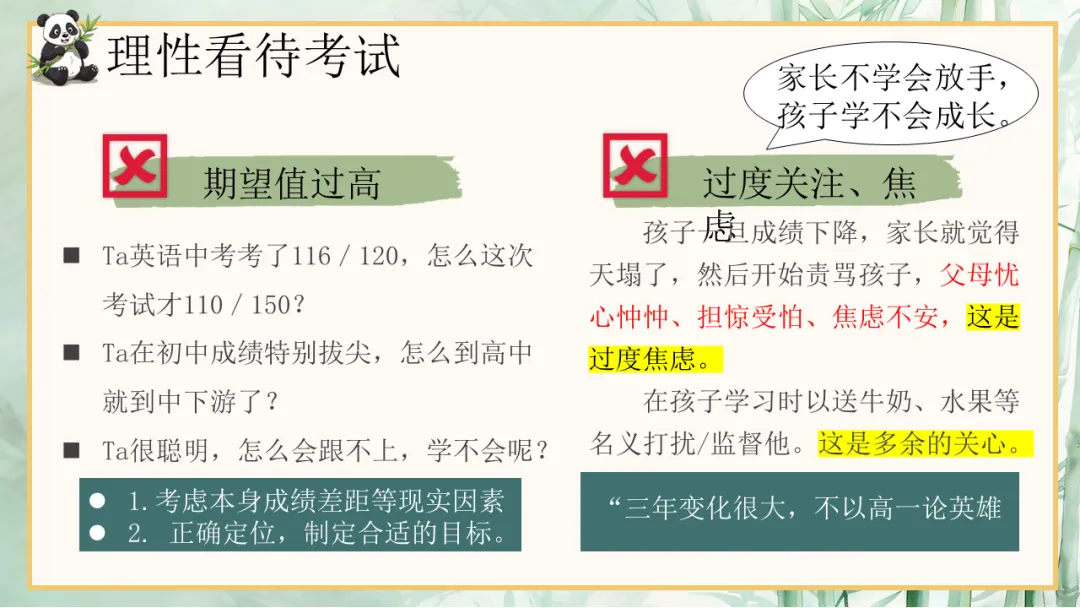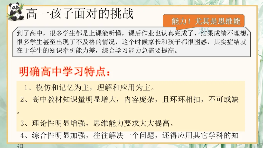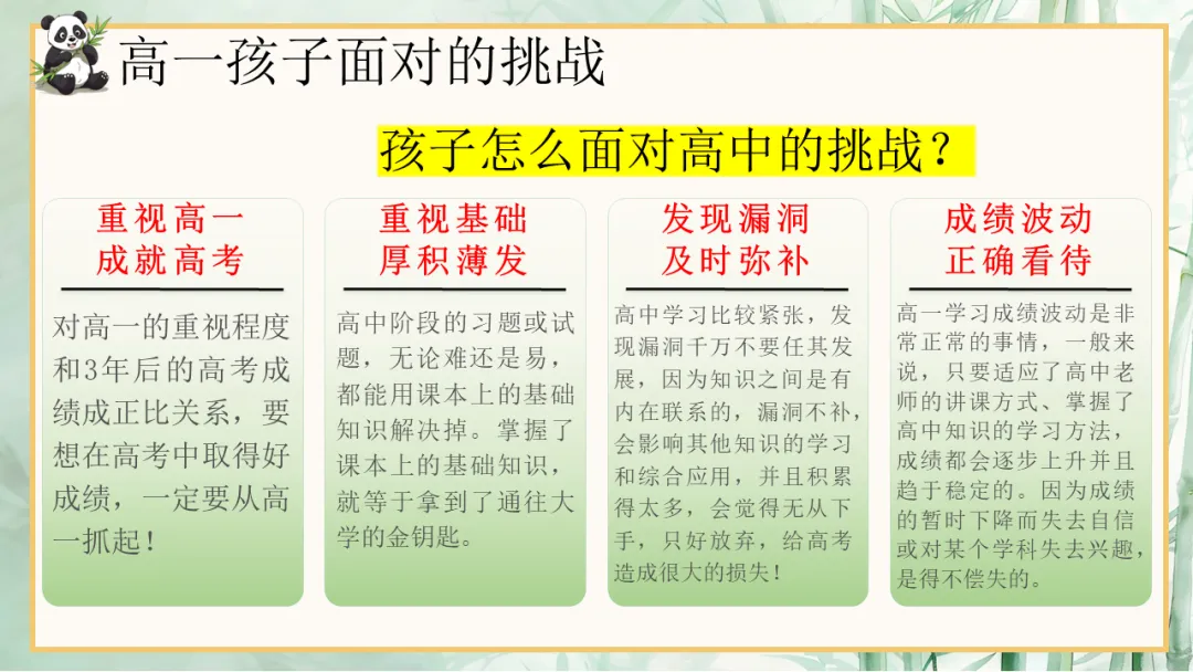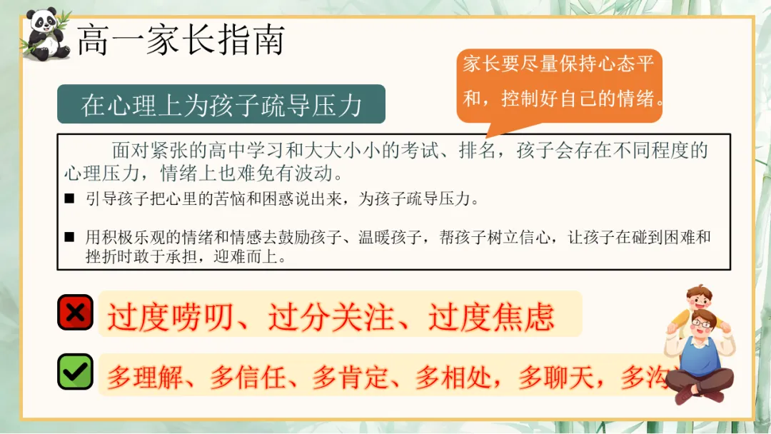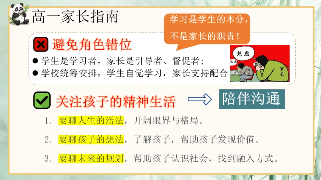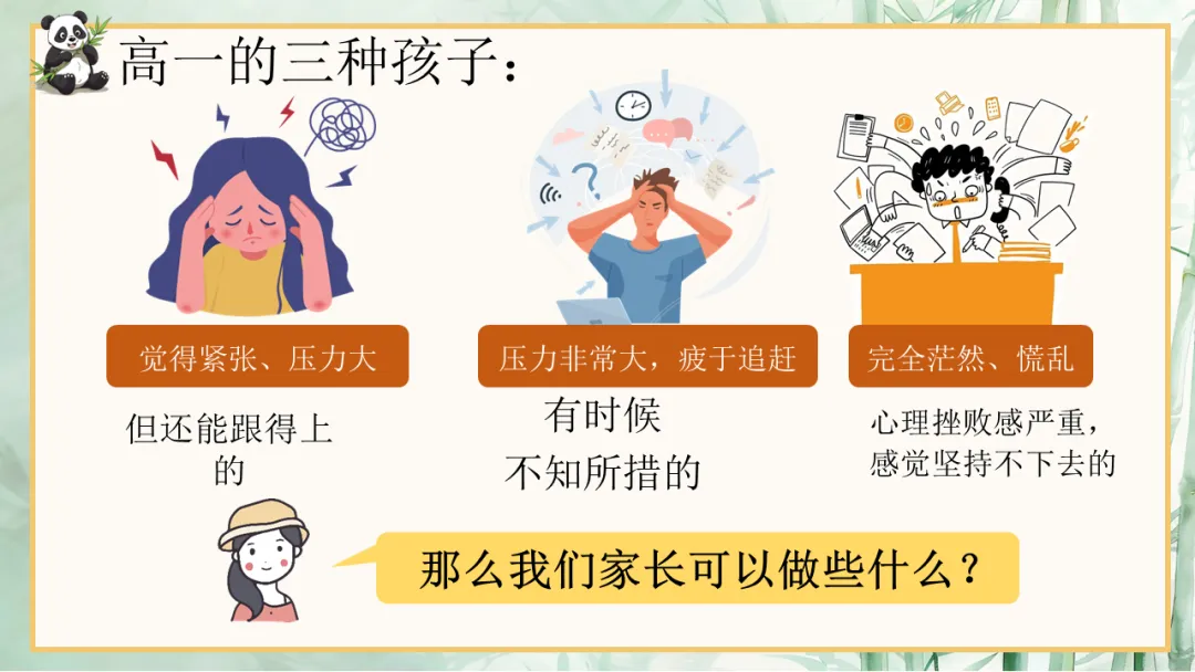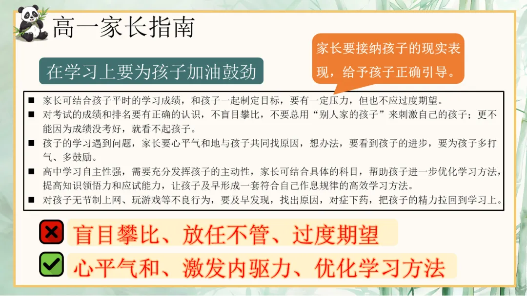 接下来,我想谈谈孩子们在高一阶段面临的一些挑战。高中学习与初中不同,知识量增大、节奏加快、思维要求更高。有些孩子可能会感到压力大、时间紧,甚至出现“假努力”“偏科”“网络依赖”等现象。这些都是成长过程中的正常现象,关键是我们如何引导。