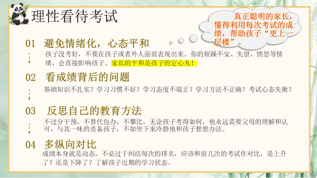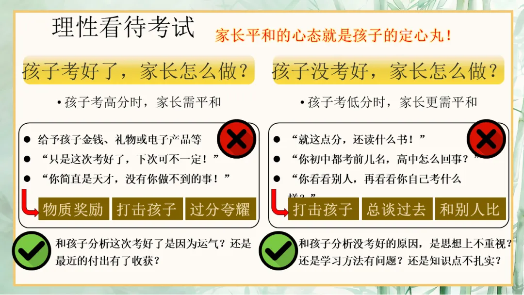 第一,心态要稳。考试不是终点,而是阶段性的检验。我们要帮助孩子正确看待成绩,不攀比、不打击,多鼓励、多支持。家长的平和,是孩子最好的定心丸。