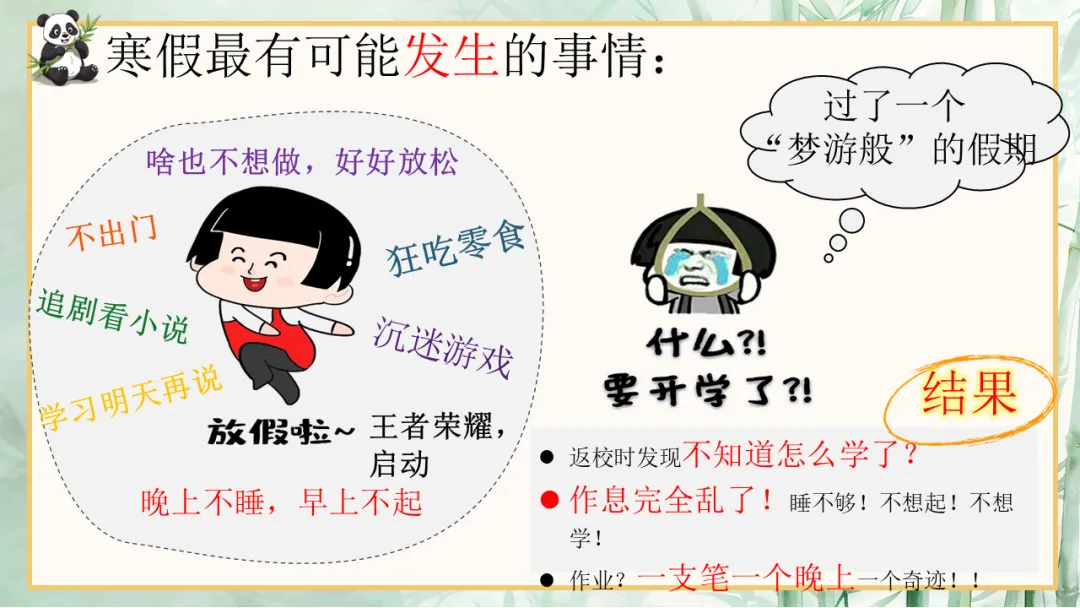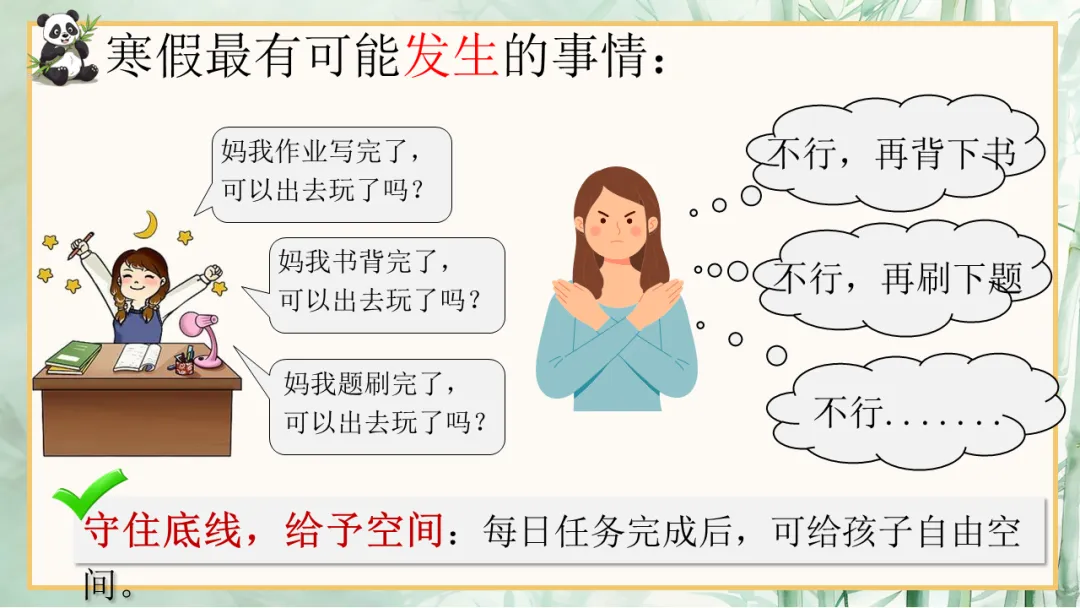 第五,假期要规划。寒假即将到来,我建议家长和孩子一起制定作息计划,平衡学习与休息,鼓励孩子参与家务、运动、阅读,避免“晚上不睡、早上不起、作业堆到最后”的情况。