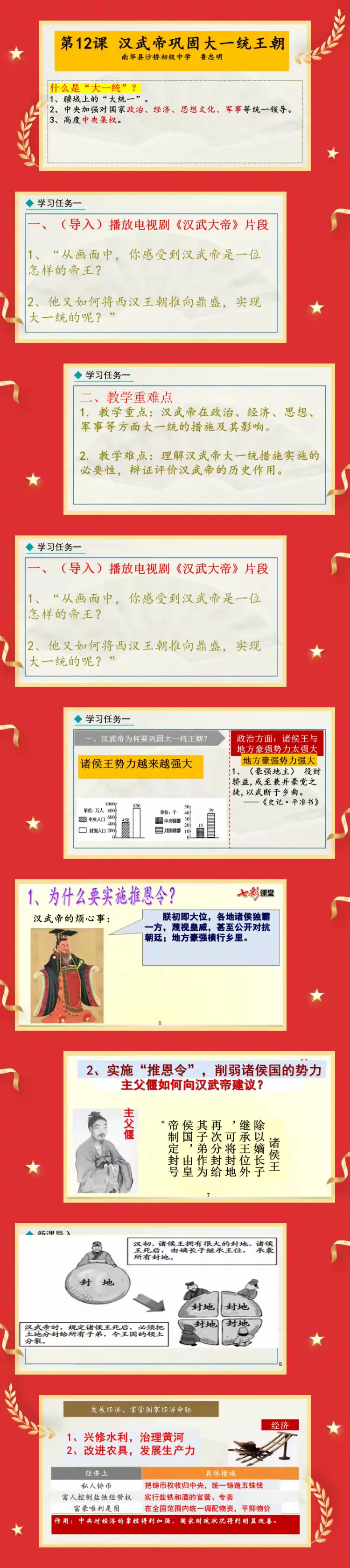 政治大一统:通过展示 “推恩令” 示意图,讲解其内容,组织学生进行角色扮演,模拟诸侯王和子弟的反应,理解 “推恩令” 削弱王国势力、加强中央集权的巧妙之处;介绍刺史制度,结合史料分析刺史的职责与作用。