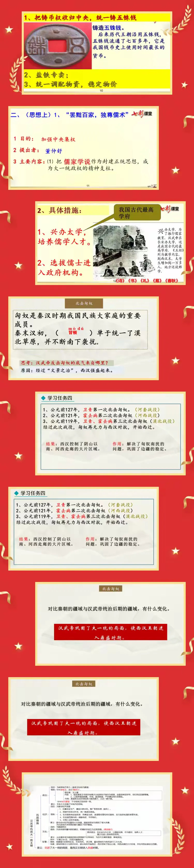 军事大一统:播放卫青、霍去病北击匈奴的战争视频片段,结合地图讲解战役经过,让学生感受汉军的英勇,体会军事行动对解除匈奴威胁、拓展疆域的重要意义。