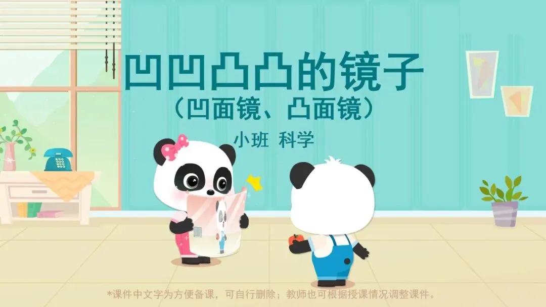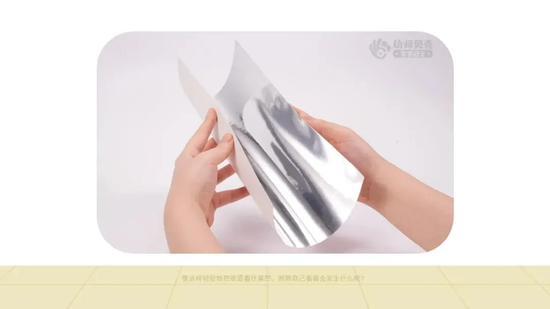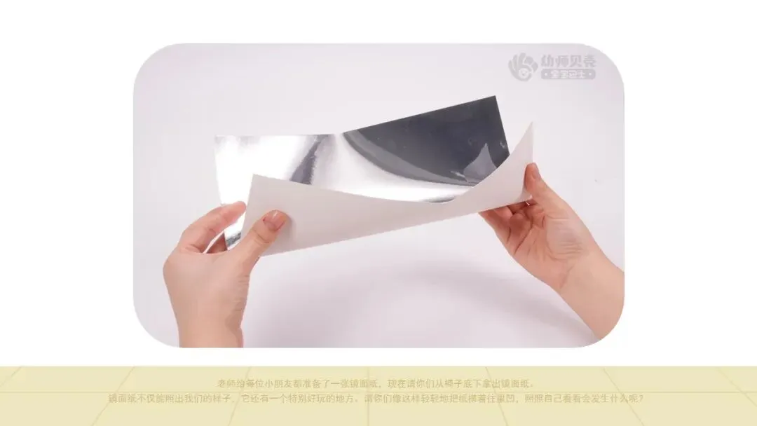 活动建议:教师拿着镜面纸依次在全体幼儿面前展示,引导幼儿感知镜面纸的特点。