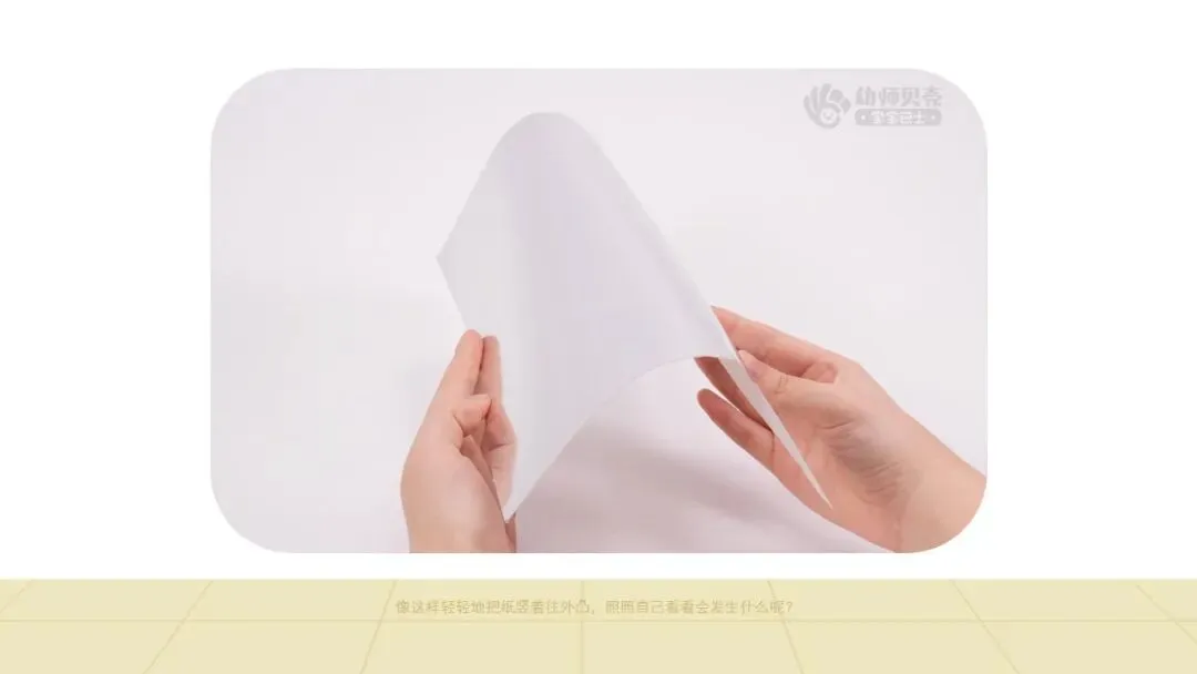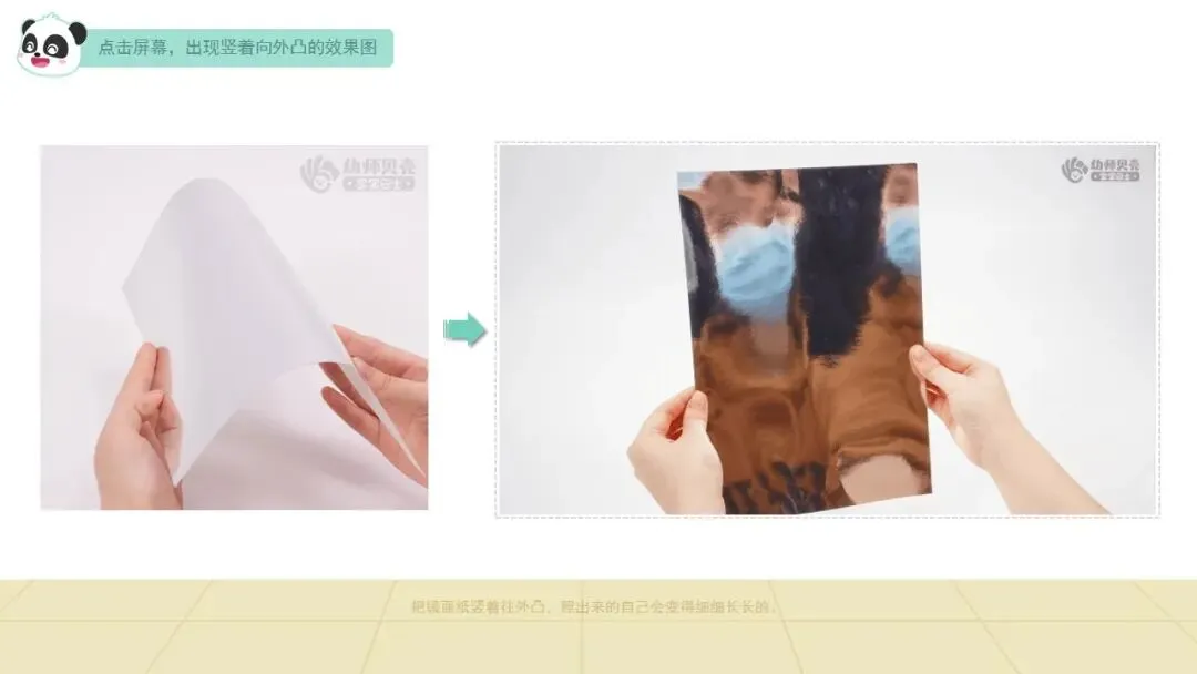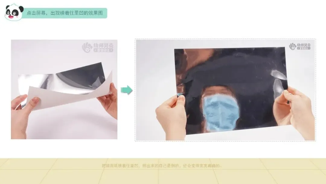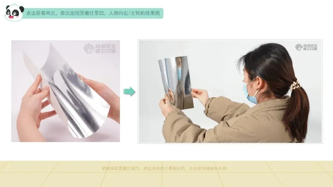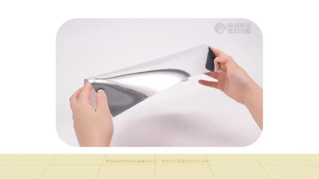 ——镜面纸不仅能照出我们的样子,它还有一个特别好玩的地方。请你们像老师这样轻轻地把纸往里凹或往外凸,再横着、竖着照一照自己,看看会发生什么呢?