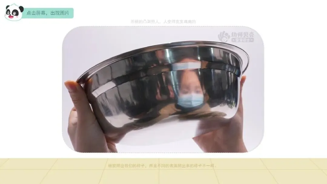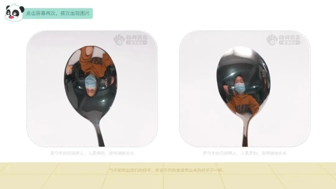 活动建议:教师请幼儿分享各种凹、凸面镜照的方式及其成像效果。若有个别效果幼儿没有探索出来,如凹面镜竖着照时会左右颠倒,教师可现场操作请幼儿观察现象,并出示图片帮助幼儿拓展经验。