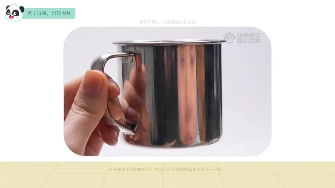 ——除了刚刚小朋友们发现的这些变化,老师也有一个不一样的发现。看看我是怎么照的?(把镜面纸往里凹,竖着照)