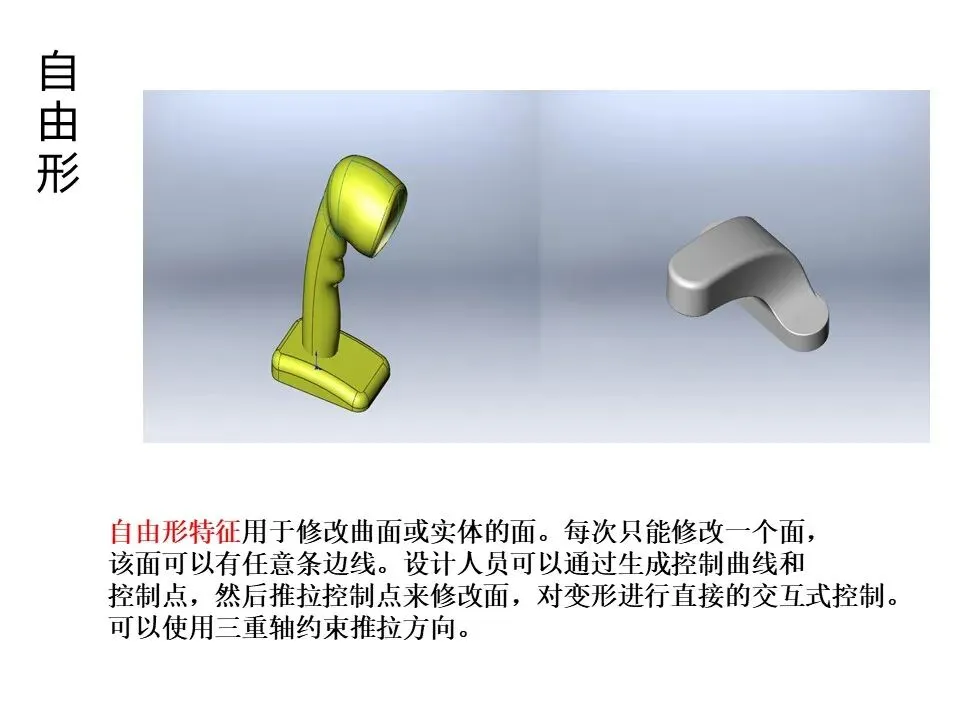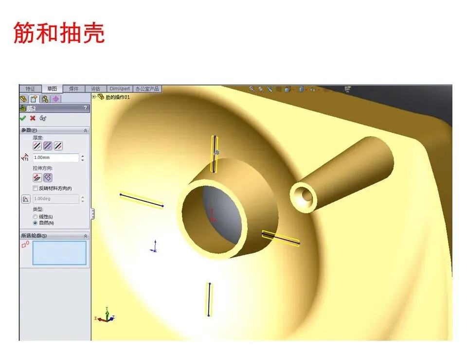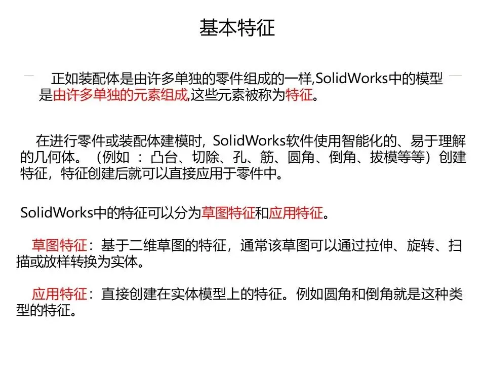 应用特征:直接在实体上操作,比如给零件边角倒圆角、给平面开异型孔、做拔模处理,常用的有圆角、倒角、孔、筋、抽壳等,主要用于优化零件结构和细节。