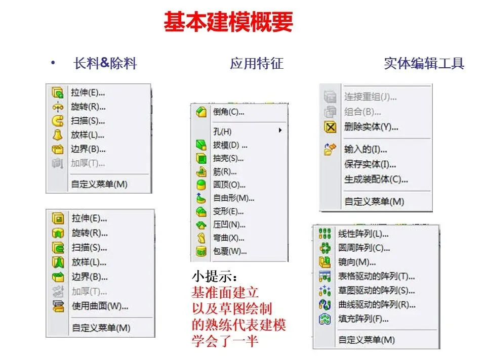 这里要提醒新手:基准面建立和草图绘制的熟练度,直接决定建模效率 —— 很多人卡壳不是因为特征不会用,而是草图没画好、基准面选不对,这步一定要多练。