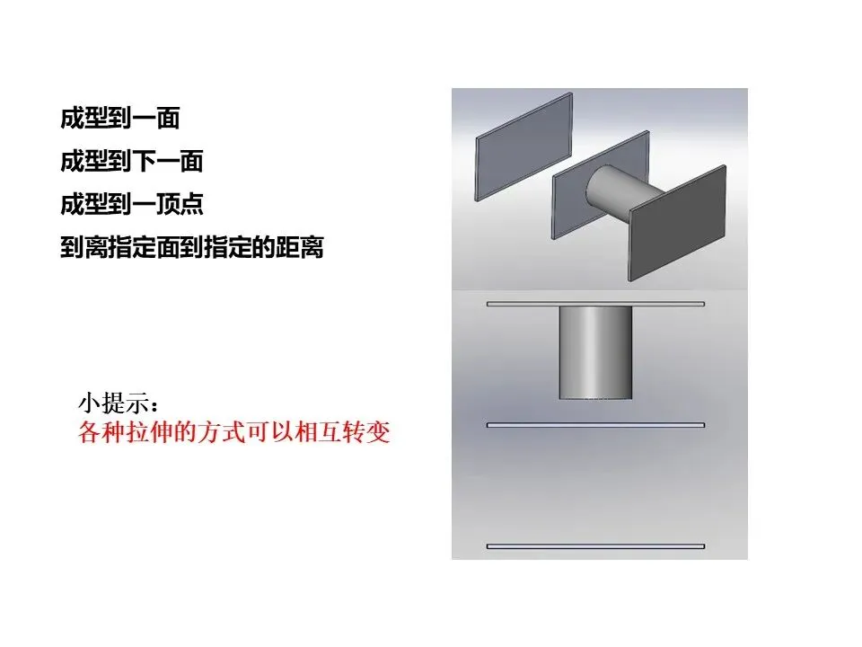 拉伸:最常用的基础特征,可选择 “成型到实体”“成型到一面” 等多种方式,灵活控制实体长度,新手建议从简单的矩形拉伸练起;