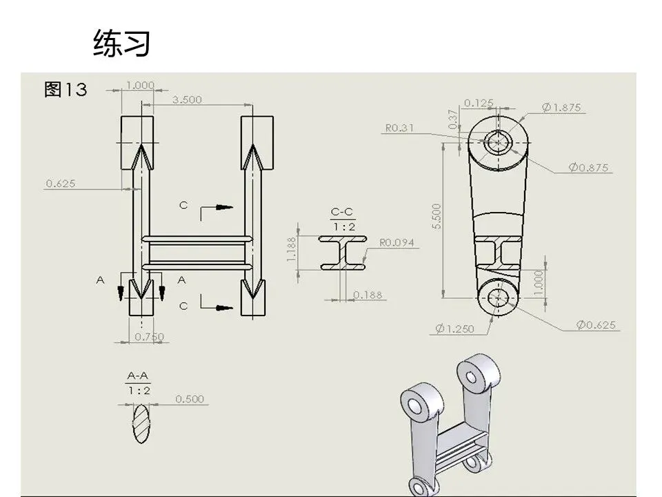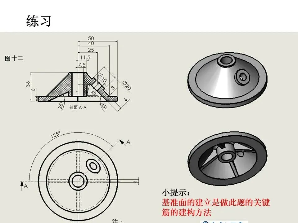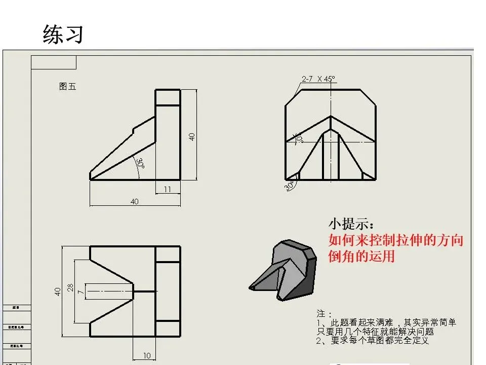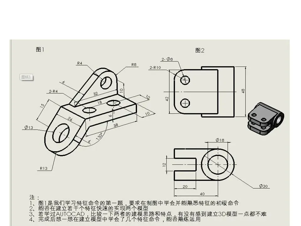 进阶练习:尝试带孔、筋、抽壳的零件,比如带沉头孔的支架,掌握异型孔向导、筋特征的用法;