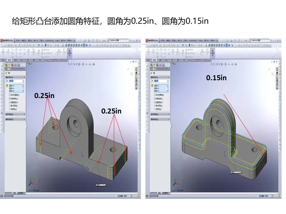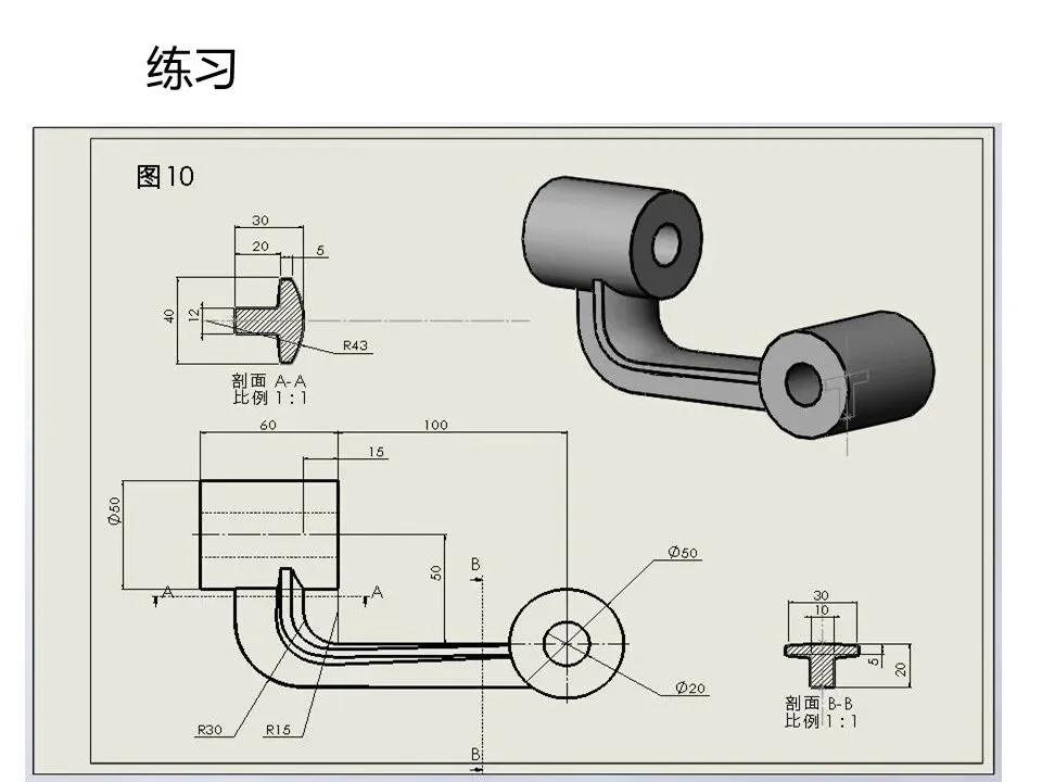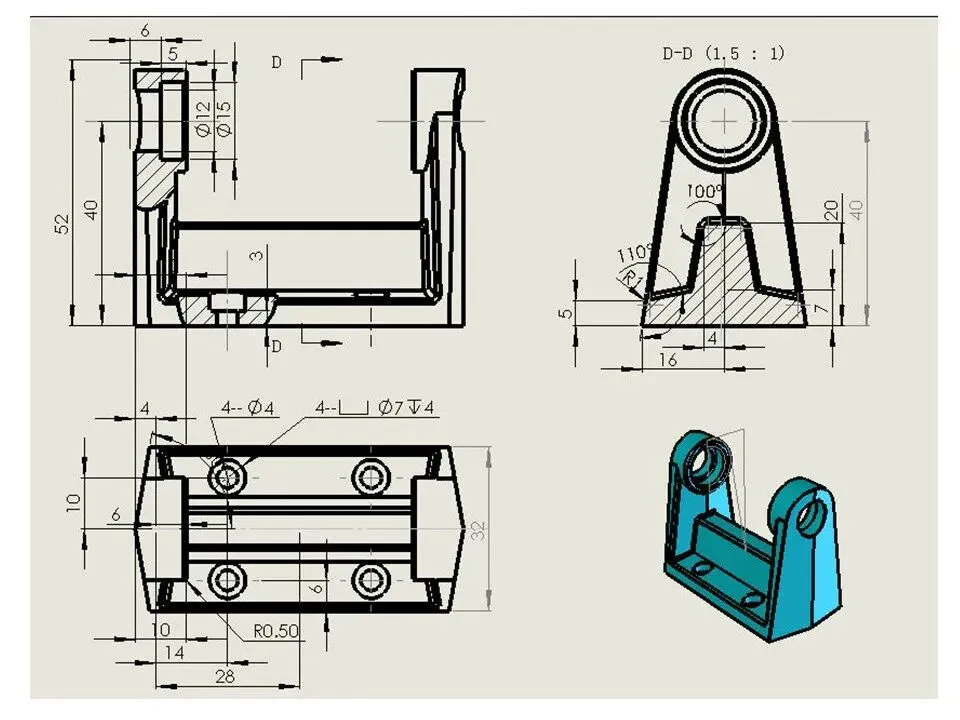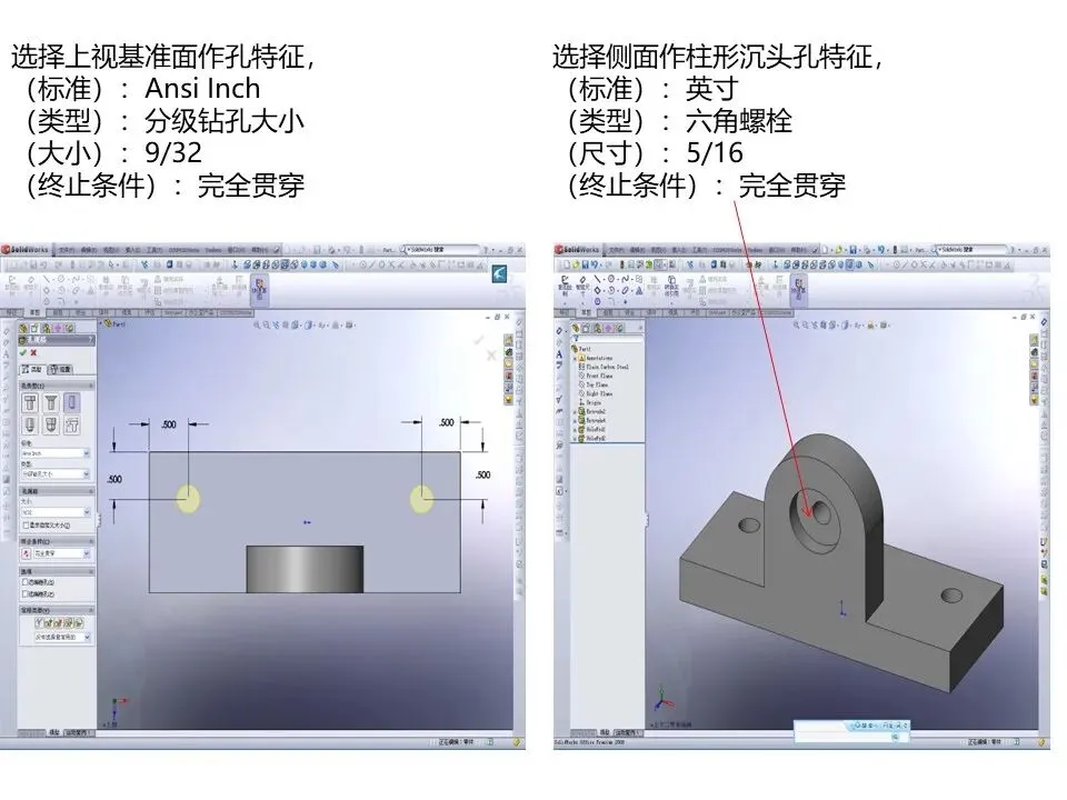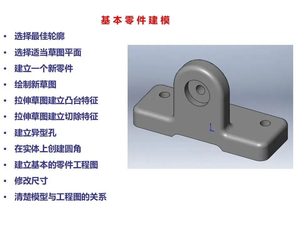 进阶练习:尝试带孔、筋、抽壳的零件,比如带沉头孔的支架,掌握异型孔向导、筋特征的用法;