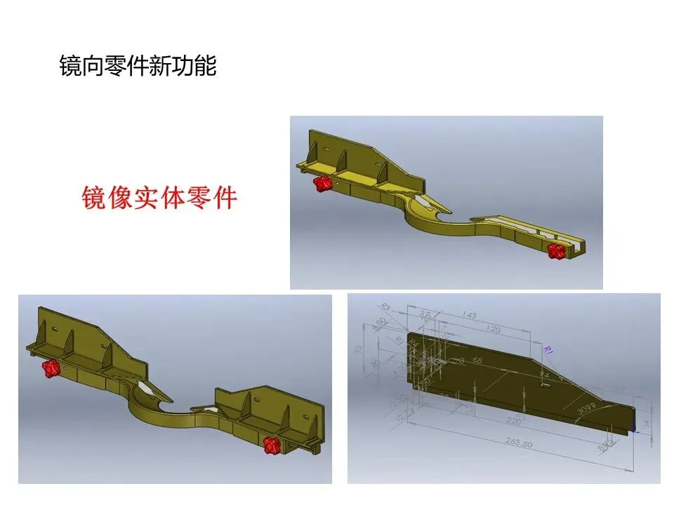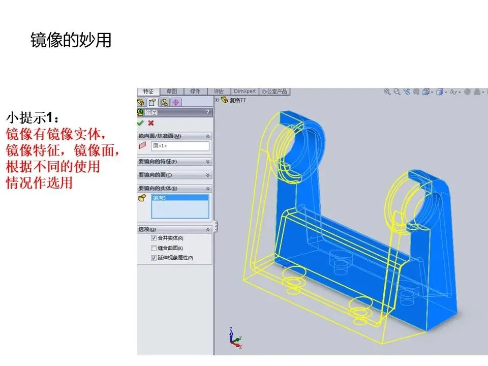 镜像工具:对称零件的 “神器”,只需画一半特征,镜像面选择对称基准面,就能快速复制另一半,支持镜像实体、特征或面,灵活适配不同场景;