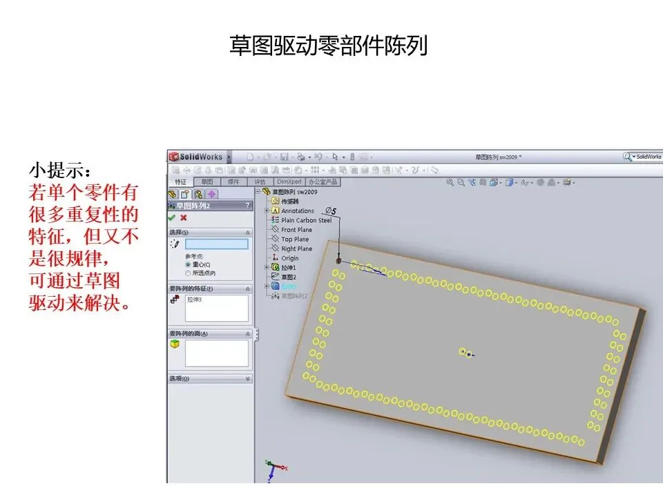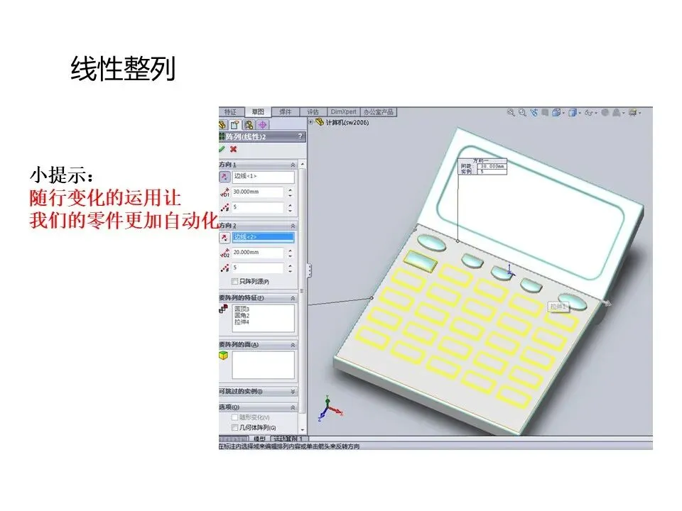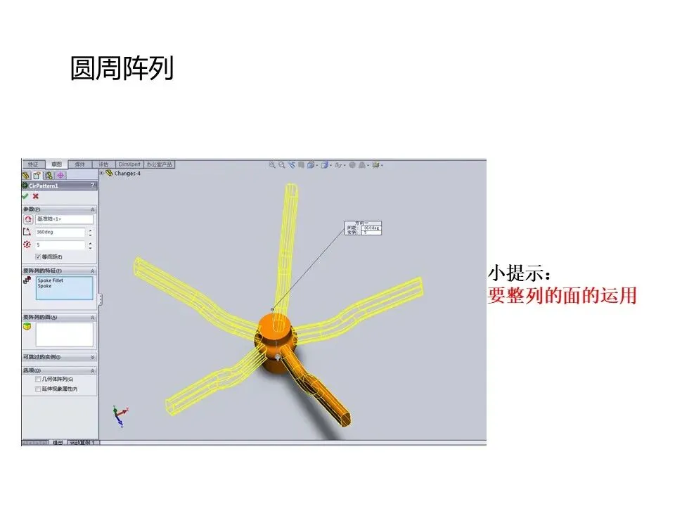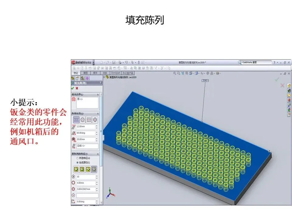 阵列工具:应对重复性特征,比如零件上均匀分布的孔,用线性阵列、圆周阵列就能一键生成,填充阵列还适合制作机箱通风口等钣金结构;