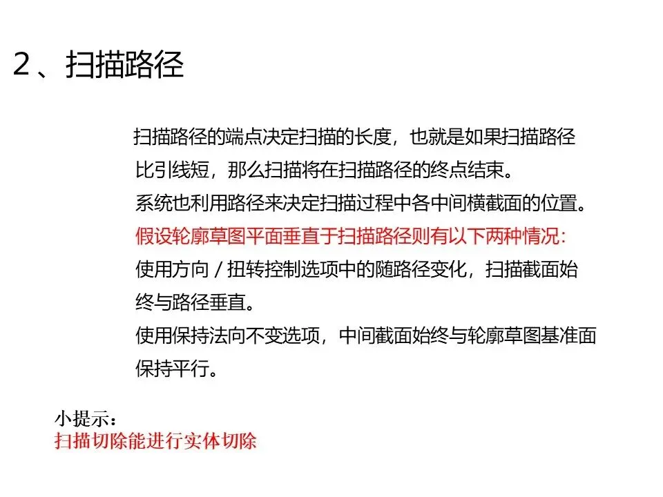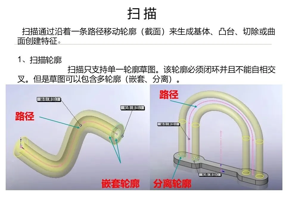 扫描:沿着路径移动轮廓生成实体,比如制作弯曲的管道,注意轮廓要闭环、路径不能太短,截面可随路径变化或保持平行;