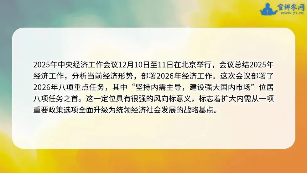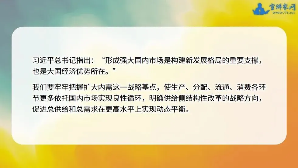大国经济的纵深与潜力,在于其内部市场的规模与活力。本课件立足新发展阶段我国经济面临的内外环境变化,深入解读2025年中央经济工作会议将“坚持内需主导,建设强大国内市场”置于首要任务的战略深意,系统阐述扩大内需从政策选项上升为战略基点的必然逻辑。