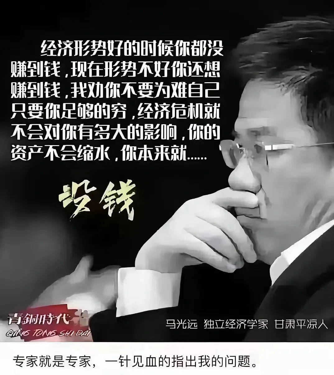 喝完鸡汤回到现实,近两年开挣钱可真难,当初越有钱的人,外表光鲜实际窟窿很大,房地产不行了之后,百业凋敝,眼看也就直播间挣钱,所以女明星男明星,女富豪男富豪纷纷出来声嘶力竭的卖,在直播间卖货,全然忘了“伐冰之家不畜牛羊”,可出来卖你也得有底线吧!把顾客当傻子蒙,王石一样没去过KTV没叫过公主摸摸唱,不代表其他人看不穿你的底色?最后用马光远的话送给你,安慰一下一年忙到头依旧没有挣到钱,还饱受各种撒币上司压榨的你我他,忙了一天回来想看个抖音轻松一下,抖音上又是朴珺又是学晶,一个明明小三上位却劝你要独立,一个外表朴实其实很精明都想继续再从你兜里掏钱,但兜里再没钱也想捐给李亚鹏,让他付清医院房租。所以赵丽蓉春晚小品的含金量还在上升:货真价实。看完我的文章如果想捐点钱给我,就点下面红色按钮。我也想像山东那位网红一样成为一名纯粹的写手。