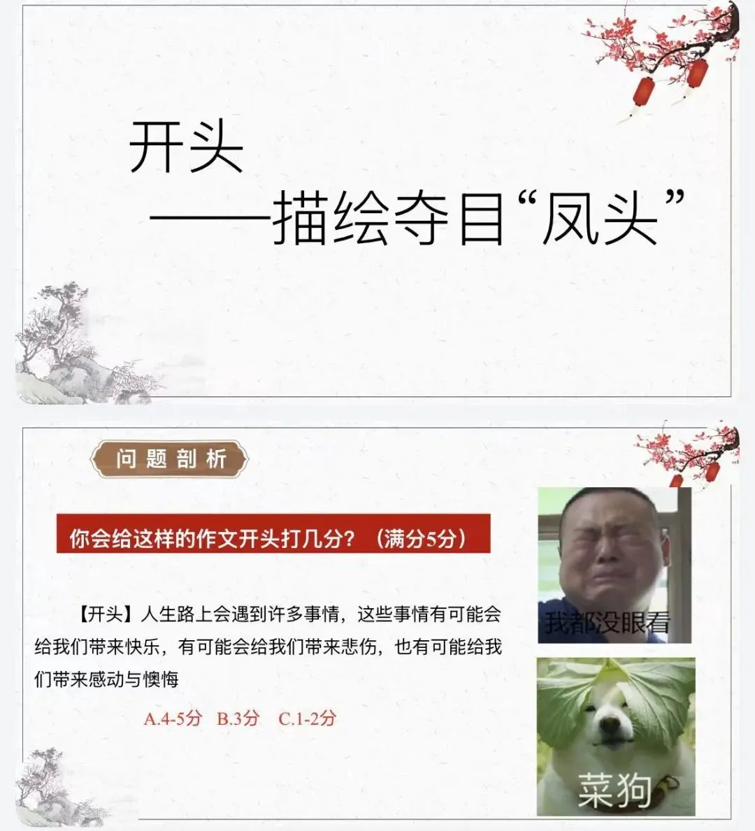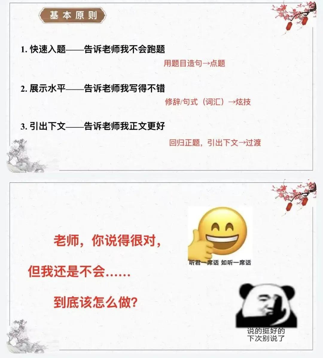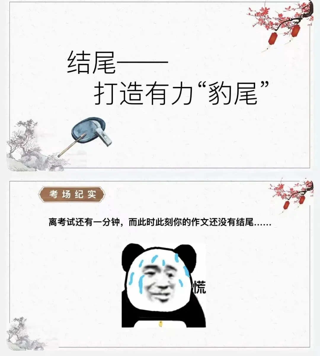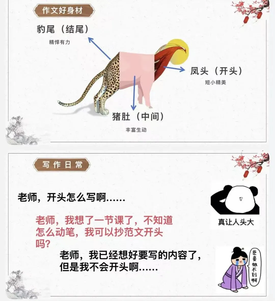 别急! “从引人入胜的风头”到“充实饱满的猪肚”,最后“打造有力的豹尾”学下来直接套用,阅卷老师眼前一亮。