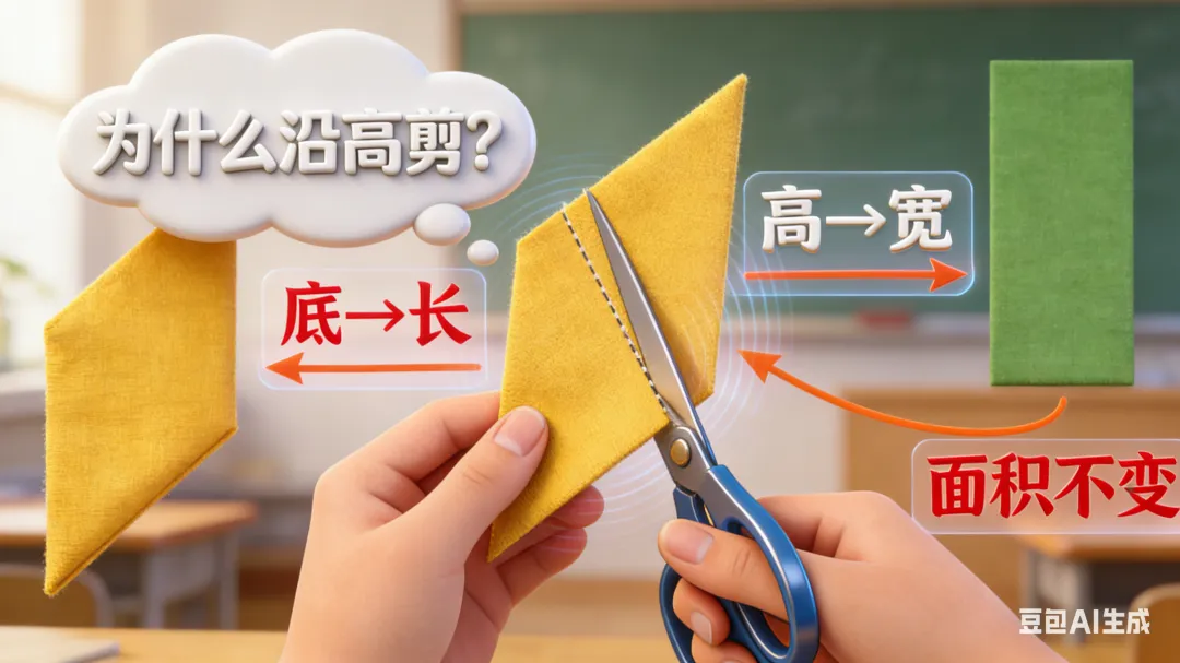 “这个活动的设计意图是:让学生亲历‘等积变形’的思维关键点——为什么一定要沿高剪开?不沿着高剪行吗?这恰恰是突破公式理解的核心。”
