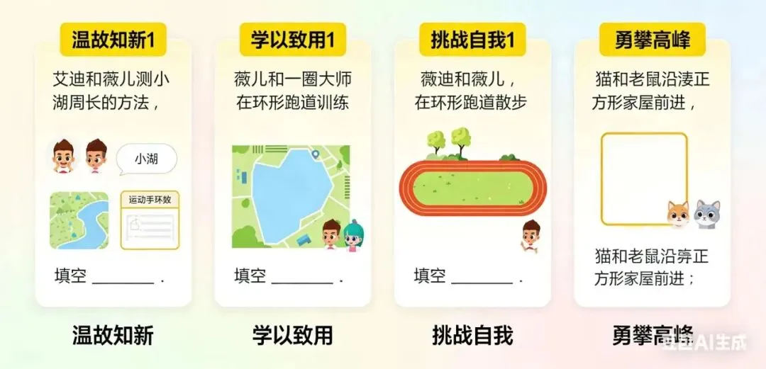 温故知新:通过生活化场景(如小湖边跑步)回顾校内环形行程等基础知识点,帮孩子筑牢根基。