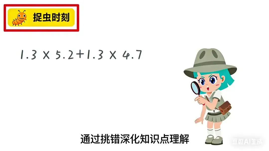示例:如下题计算 1.3×5.2+1.3×4.7 时,原解法错误地将 5.2+4.7 算成 10,孩子通过挑错,能更扎实掌握乘法分配律的应用。