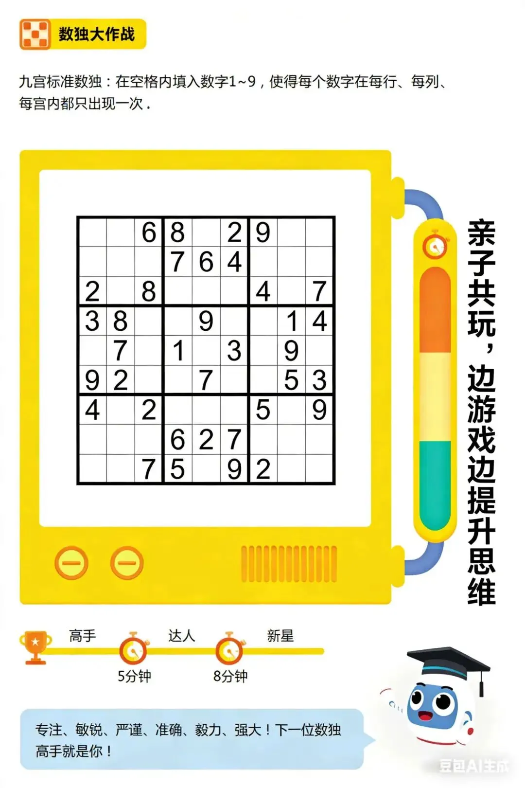 新增九宫格数独游戏,既是数学思维训练,也是高质量的亲子陪伴时光,让学习不再是孩子一个人的事。