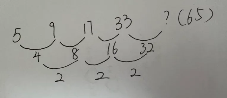 你会发现,5和9之间相差4,9和17之间相差8,17和33之间相差16,那4、8、16之间规律的是都乘相同的数2,因此,16×2=32,33和( )相差32,33+32=65,所以答案为65