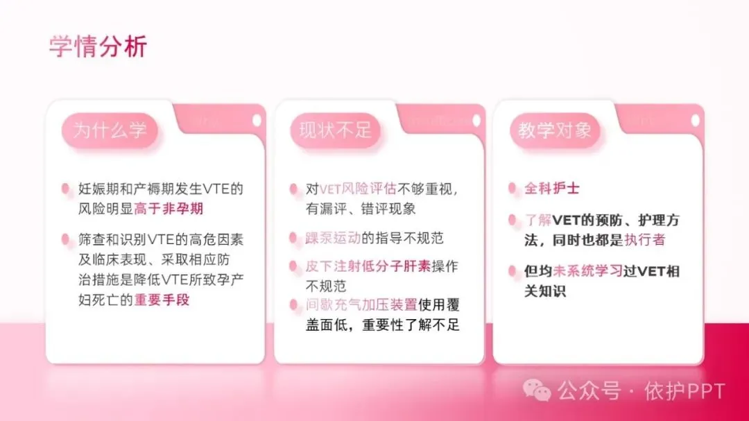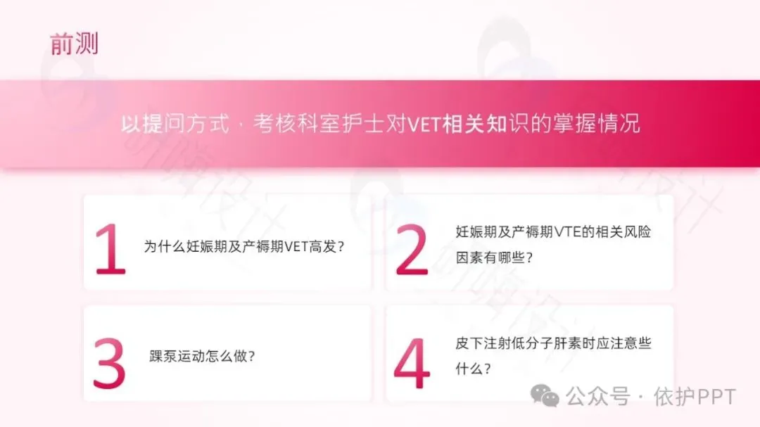 通过讲解科室近期对VET风险评估、预防、护理等工作存在的不足及问题引出此次业务学习的题目。